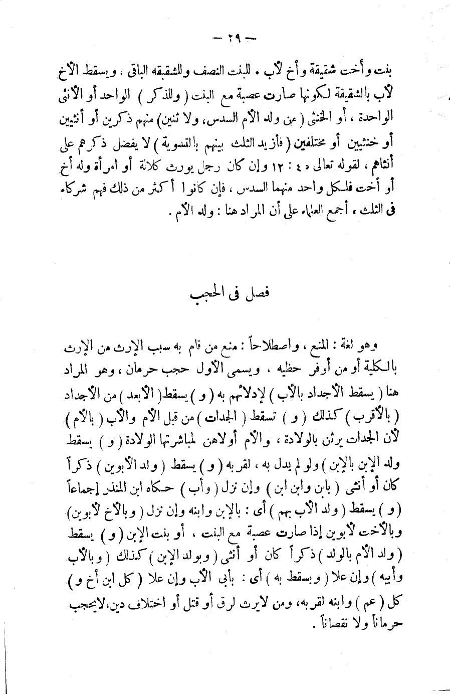 بنت وأخت شقيقة وأخ لأب للبنت النصف وللشقيقة الباقي ، ويسقط الأخ لأب بالشقية لكونها صارت عصبة مع البنت ( وللذكر ) الواحد أو الأنثى الواحدة ، أو الخنثى ( من ولد الأم السدس ، ولاثنين ) منهم ذكرين أو أثنتين أو خنثيين أو مختلفين ( فأزيد الثلث بينهم بالتسوية ) لا يفضل ذكرهم على أنثاهم ، لقوله تعالى " 4 : 12 " وإن كان رجل يورث كلالة أو أمرأة وله أخ أو أخت فلكل واحد منهما السدس فإن كانوا أكثر من ذلك فهم شركاء في الثلث أجمع العلماء على أن المراد هنا ولد الأم % فصل في الحجب