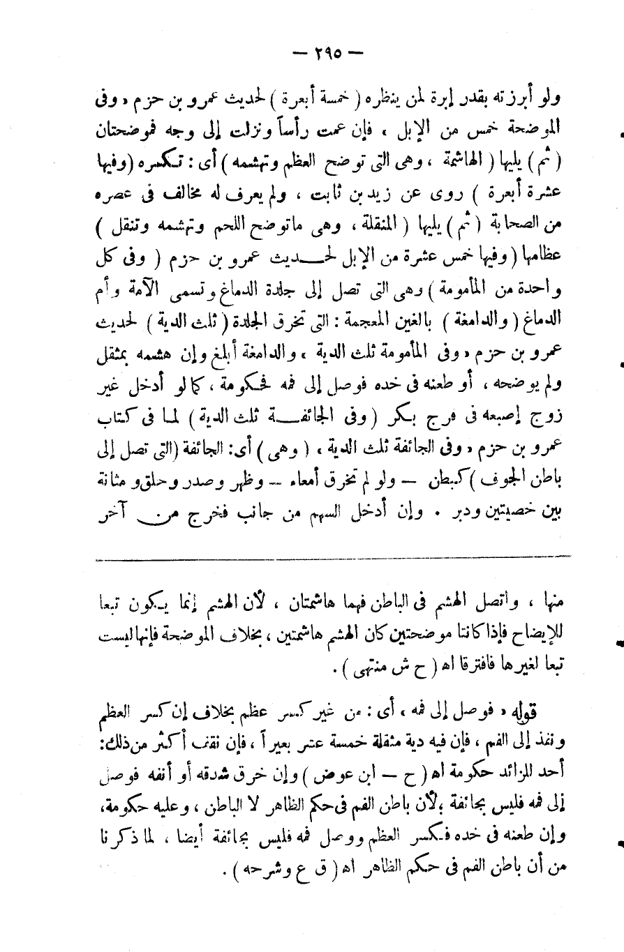 ولو أبرزته بقدر إبرة لمن ينظره ( خمسة أبعرة ) لحديث عمرو بن حزم وفي الموضحة خمس من الإبل فإن عمت رأسا ونزلت إلى وجه فموضحتان ( ثم ) يليها ( الهاشمة وهي التي توضح العظم وتهشمه ) أي تكسره ( وفيها عشرة أبعرة ) روي عن زيد بن ثابت ولم يعرف له مخالف في عصره من الصحابة ( ثم ) يليها ( المنقلة وهي ما توضح العظم وتهشمه وتنقل عظامها وفيها خمسة عشر من الإبل ) لحديث عمرو بن حزم ( وفي كل واحدة من المأمومة ) وهي التي تصل إلى جلدة الدماغ وتسمى الآمة وأم الدماغ ( والدامغة ) بالغين المعجمة وهي التي تخزق الجلدة ( ثلث الدية ) لحديث عمرو بن حزم وفي المأمومة ثلث الدية والدامغة أبلغ وإن هشمه بمثقل ولم يوضحه أو طعنه في خده فوصل إلى فمه فحكومة كما لو أدخل غير زوج أصبعه في فرج بكر ( وفي الجائفة ثلث الدية ) لما في كتاب عمرو بن حزم في الجائفة ثلث الدية ( وهي ) أي الجائفة ( التي تصل إلى بطن الجوف ) كبطن ولو لم تخرق أمعاء وظهر وصدر ومثانة وبين خصيتين ودبر وإن أدخل السهم من جانب فخرج من الأخر