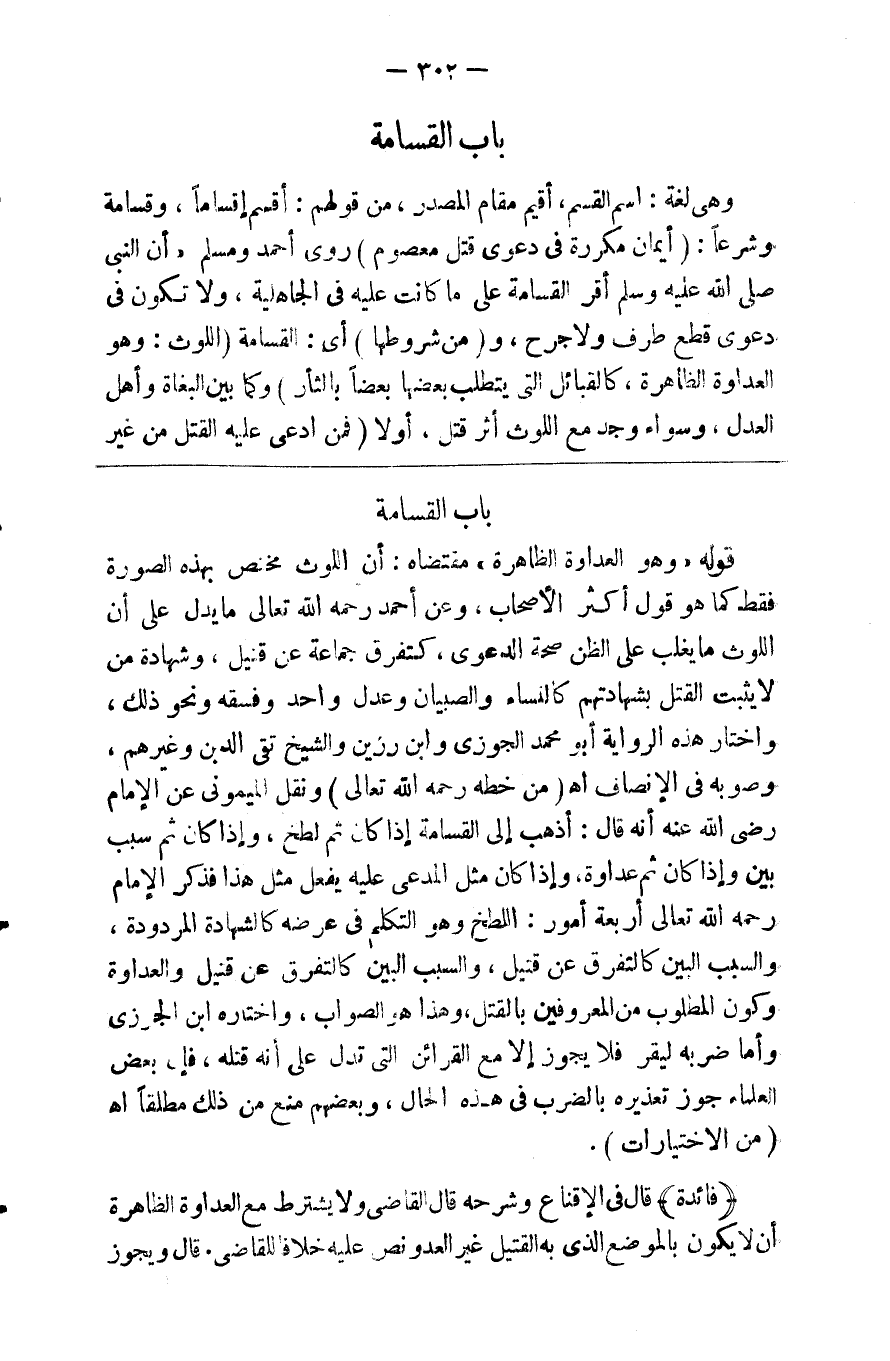 (وهي) لغة اسم القسم أقيم مقام المصدر من قولهم أقسم إقساما وقسامة وشرعا (أيمان مكررة في دعوى قتل معصوم) روى أحمد ومسلم أن النبي صلى الله عليه وسلم أقرالقسامة على ما كانت عليه في الجاهلية ولا تكون في دعوى قطع طرف ولا جرح و (من شروطها) أي القسامة (اللوث وهو العداوة الظاهرة كالقبائل التي يطلب بعضها بعضا بالثأر) وكما بين البغاة وأهل العدل وسواء وجد مع اللوث أثر القتل أو لا (فمن ادعى عليه القتل من غي