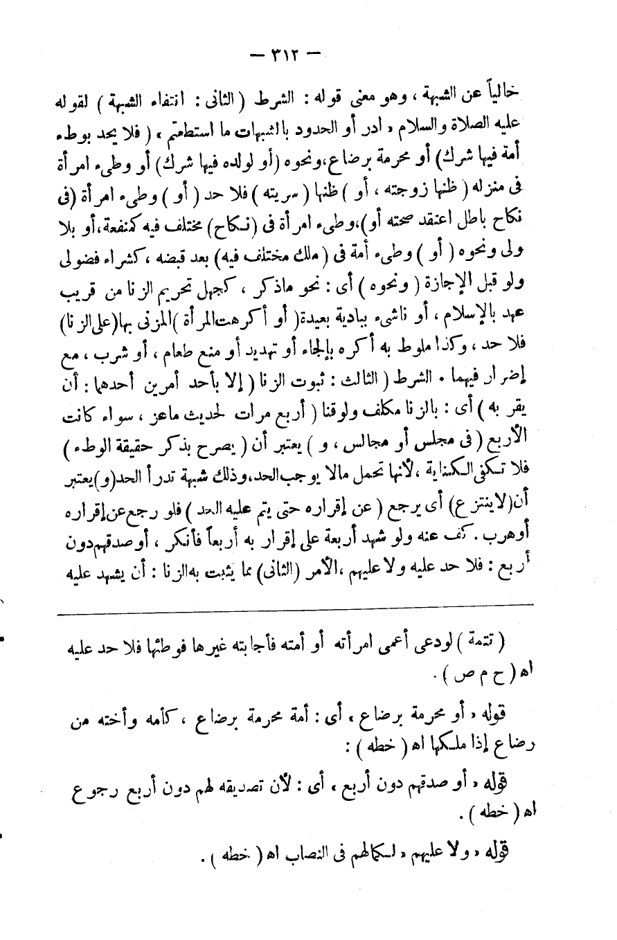 خاليا من الشبهة وهو معنى قوله الشرط ( الثاني انتفاء الشبهة ) لقوله صلى الله عليه وسلم ادرءوا الحدود بالشبهات ما استطعتم ( فلا يحد بوطء أمة له فيها شرك ) أو محرمة برضاع ونحوه ( أو لولده ) فيها شرك ( أو وطئ امرأة ) في منزله ( ظنها زوجته أو ) ظنها ( سريته ) فلا حد ( أو ) وطئ امراة ( في نكاح باطل اعتقد صحته أو ) وطئ امرأة في ( نكاح ) مختلف فيه كمتعة أو بلا ولي ونحوه ( أو ) وطئ أمته في ( ملك مختلف فيه ) بعد قبضه كشركاء فضولي ولو قبل الإجازة ( ونحوه ) أي نحو ماذكر كجهل تحريم الزنا من قريب عهد بإسلام أو ناشئ ببادية بعيدة ( أو أكرهت المرأة ) المزني بها ( على الزنا ) فلا حد وكذا ملوط به أكره بإلجاء أو تهديد أو منع طعام أو شراب مع إضرار فيها الشرط ( الثالث ثبوت الزنا ولايثبت ) الزنا ( إلا بأحد أمرين ) أحدهما أن يقر به ) أي بالزنا مكلف ولو قنا ( أربع مرات ) لحديث ماعز وسواء كانت الأربع ( في مجلس أو مجالس و ) يعتبر أن ( يصرح ) بذكر حقيقة الوطء فلا تكفي الكناية لأنها تحتمل ما لا يوجب الحد وذلك شبهة تدرأ الحد ( و ) يعتبر أن ( لاينزع ) أي يرجع ( عن إقراره حتى يتم عليه الحد ) فلو رجع عن إقراره أو هرب كف عنه ولو شهد أربعة على إقراره به أربعا فأنكر أو صدقهم دون أربع فلا حد عليه ولا عليهم الأمر ( الثاني ) مما يثبت به الزنا ( أن يشهد