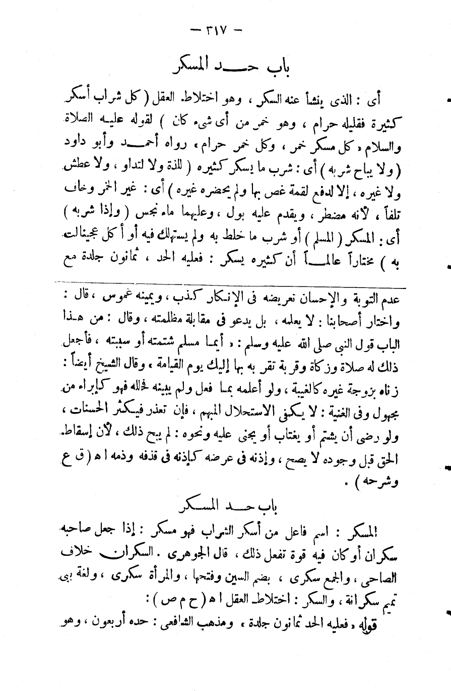 أي الذي ينشأ عنه السكر وهو اختلاط العقل (كل شراب أسكر كثيره فقليله حرام وهو خمر من أي شيء كان) لقوله صلى الله عليه وسلم كل مسكر خمر وكل خمر حرام رواه أحمد وأبو داود (ولايباح شربه) أي شرب مايسكر كثيره (للذة ولا لتداو ولا عطش ولا غيره إلا لدفع لقمة غص بها ولم يحضره غيره) أي غير الخمر وخاف تلفا لأنه مضطر ويقدم عليه بول وعليهما ماء نجس (وإذا شربه) أي المسكر (المسلم) أو شرب ماخلط به ولم يستهلك فيه أو أكل عجينا لت به (مختارا لعالما أن كثيره يسكر فعليه الحد ثمانون جلدة مع