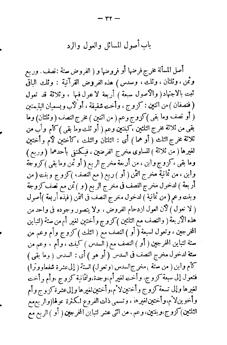 أصل المسألة مخرج فرضها أو فروضها ( والفروض ستة نصف وربع وثمن وثلثان وثلث وسدس ) هذه الفروض القرآنية وثلث الباقي ثبت بالاجتهاد ( والأصول سبعة ) أربعة لا عول فيها وثلاثة قد تعول ( فنصفان ) من اثنين كزوج وأخت شقيقة أو لأب ويسميان باليتيمتين ( أو نصف وما بقي ) كزوج وعم ( من اثنتين ) مخرج النصف ( وثلثان ) وما بقي من ثلاثة مخرج الثلثين كبنتين وعم ( أو ثلث وما بقي ) كأم وأب من ثلاثة مخرج الثلث ( أو هما ) أي الثلثان والثلث كأختين لأم وأختين لغيرهما ( من ثلاثة ) لتساوي مخرج الفرضين فيكتفي بأحدهما ( وربع ) وما بقي كزوج وابن من أربعة مخرج الربع ( أو ثمن وما بقي ) كزوجة وابن من ثمانية مخرج الثمن ( أو ) ربع ( مع النصف ) كزوج وبنت ( من أربعة ) لدخول مخرج النصف في مخرج الربع ( و ) ثمن مع نصف كزوجة وبنت عم ( من ثمانية ) لدخول مخرج النصف في الثمن ( فهذه أربعة ) أصول ( لا تعول ) لأن العول ازدحام الفروض ولا يتصور وجوده في واحد من هذه الأربعة ( والنصف مع الثلثين ) كزوج وأختين لغير أم من ستة لتباين المخرجين وتعول لسبعة ( أو ) النصف مع ( الثلث ) كزوج وأم وعم من ستة لتباين المخرجين أو النصف مع ( السدس ) كبنت وأم وعم من ستة لدخول مخرج النصف في السدس ( أو هو ) أي السدس ( وما بقي ) كأم وابن ( من ستة ) مخرج السدس ( وتعول ) الستة ) ( إلى عشرة شفعا ووترا ) فتعول إلى سبعة كزوج وأخت لغير أم وجدة ولثمانية كزوج وأم وأخت لغيرها و إلى تسعة كزوج وأختين لأم وأختين لغيرها وإلى عشرة كزوج وأم وأخوين لأم وأختين لغيرها وتسمى ذات الفروخ لكثرة عولها ( والربع مع الثلثين ) كزوج وبنتين وعم من اثني عشر لتباين المخرجين ( أو ) الربع مع