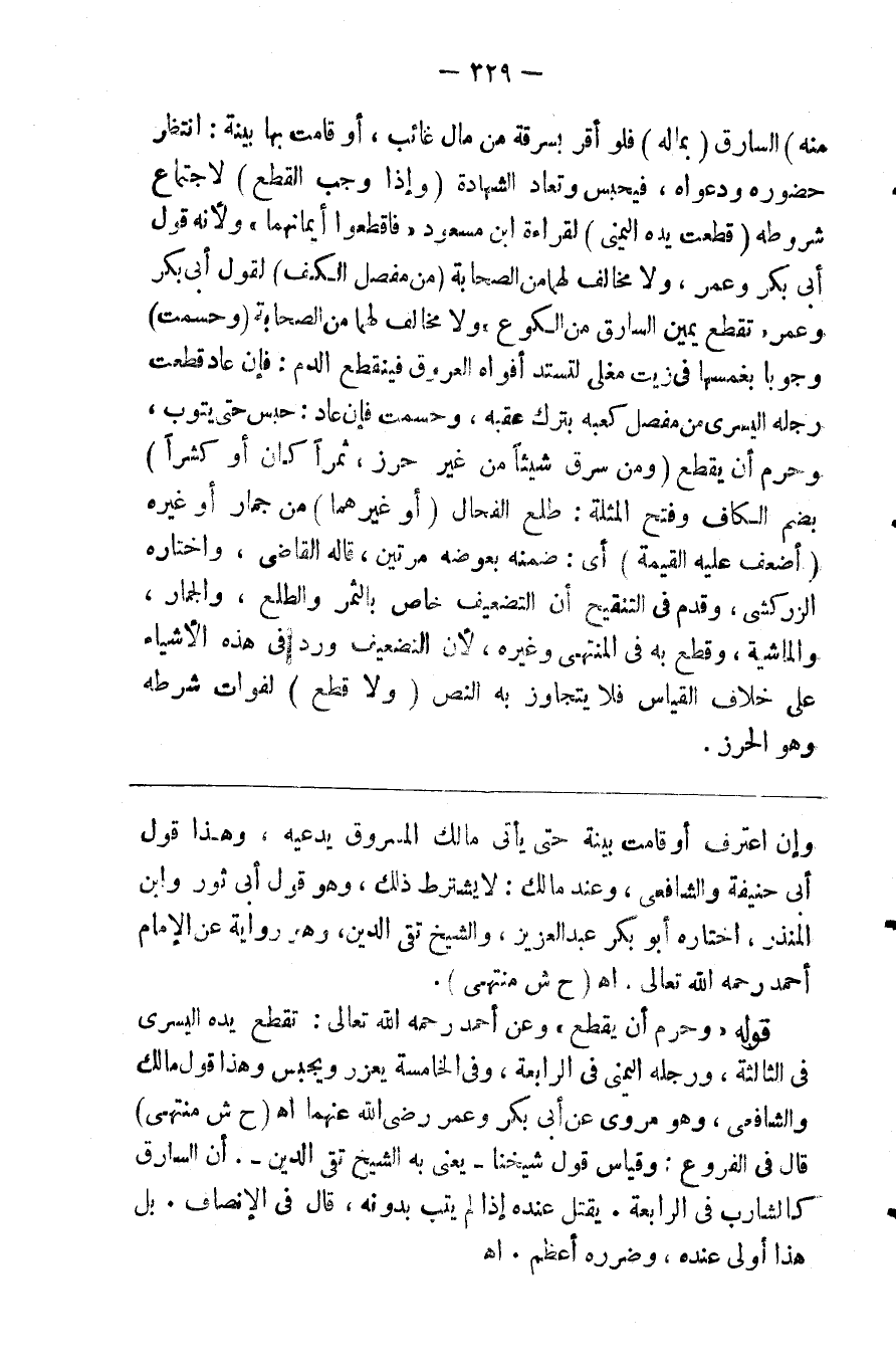 منه ) السارق ( بماله ) فلو أقر بسرقة من مال غائب أو قامت بها بينة انتظر حضوره ودعواه فيحبس وتعاد الشهادة ( وإذا وجب القطع ) لاجتماع شروطه ( قطعت يده اليمنى ) لقراءة ابن مسعود فاقطعوا أيمانهما ولأنه قول أبي بكر وعمر ولا مخالف لهما من الصحابة ( من مفصل الكف لقول ) أبي بكر وعمر تقطع يمين السارق من الكوع ولا مخالف لهما من الصحابة ( وحسمت ) وجوبا بغمسها في زيت مغلي لتسد أفواه العروق فينقطع الدم فإن عاد قطعت رجله اليسرى من مفصل كعبه بترك عقبه وحسمت فإن عاد حبس حتى يتوب وحرم أن يقطع ( ومن سرق شيئا من غير حرز ثمرا كان أو كثرا ) بضم الكاف وفتح المثلثة طلع الفحال ( أو غيرهما ) من جمار أو غيره ( أضعفت عليه القيمة ) أي ضمنه يعوضه مرتين قاله القاضي واختاره الزركشي وقدم في التنقيح أن التضعيف خاص بالثمر والطلع والجمار والماشية وقطع به في المنتهى وغيره لأن التضعيف ورد في هذه الأشياء على خلاف القياس فلا يتجاوز به محل النص ( ولا قطع ) لفوات شرطه وهو الحرز