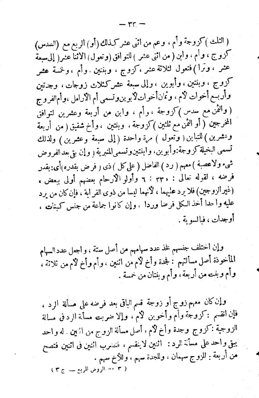 ( الثلث ) كزوجة وأم وعم من اثني عشر كذلك ( أو ) الربع مع ( السدس ) كزوج وأم وابن ( من اثني عشر ) للتوافق ( وتعول ) الإثنا عشر ( إلى سبعة عشر وترا ) فتعول لثلاثة كزوج وبنتين وأم ولخمسة عشر كزوج وبنتين وأبوين وإلى سبعة عشر كثلاث زوجات وجدتين وأربع أخوات لأم وثمان أخوات لأبوين وتسمى أم الأرامل وأم الفروخ ( والثمن مع السدس ) كزوجة وأم وابن من أربعة وعشرين لتوافق المخرجين ( أو ) الثمن مع ( ثلثين ) كزوجة وبنتين وأخ شقيق ( من أربعة وعشرين ) للتباين ( وتعول ) مرة واحدة ( إلى سبعة وعشرين ) ولذلك تسمى البخيلة كزوجة وأبوين وابنتين وتسمى المنبرية ( وإن بقي بعد الفروض شيء ولا عصبة ) معهم ( رد ) الفاضل ( على كل ) ذي ( فرض بقدره ) أي بقدر فرضه لقوله تعالى { وأولو الأرحام بعضهم أولى ببعض } غير الزوجين فلا يرد عليهما لأنهما ليسا من ذوي القرابة فإن كان من يرد عليه واحدا أخذ الكل فرضا وردا وإن كانوا جماعة من جنس كبنات أو جدات فبالسوية وإن اختلف جنسهم فخذ عدد سهامهم من أصل ستة واجعل عدد السهام المأخوذة أصل مسألتهم فجدة وأخ لأم من اثنين وأم وأخ لأم من ثلاثة وأم وبنت من أربعة وأم وابنتان من خمسة وإن كان معهم زوج أو زوجة قسم الباقي بعد فرضه على مسألة الرد فإن انقسم كزوجة وأم وأخوين لأم وإلا ضربت مسألة الرد في مسألة الزوجية كزوج وجدة وأخ لأم أصل مسألة الزوج من اثنين له واحد يبقى واحد على مسألة الرد اثنين لاينقسم فتضرب اثنين في اثنين فتصح من أربعة للزوج سهمان وللجدة سهم وللأخ سهم التصحيح