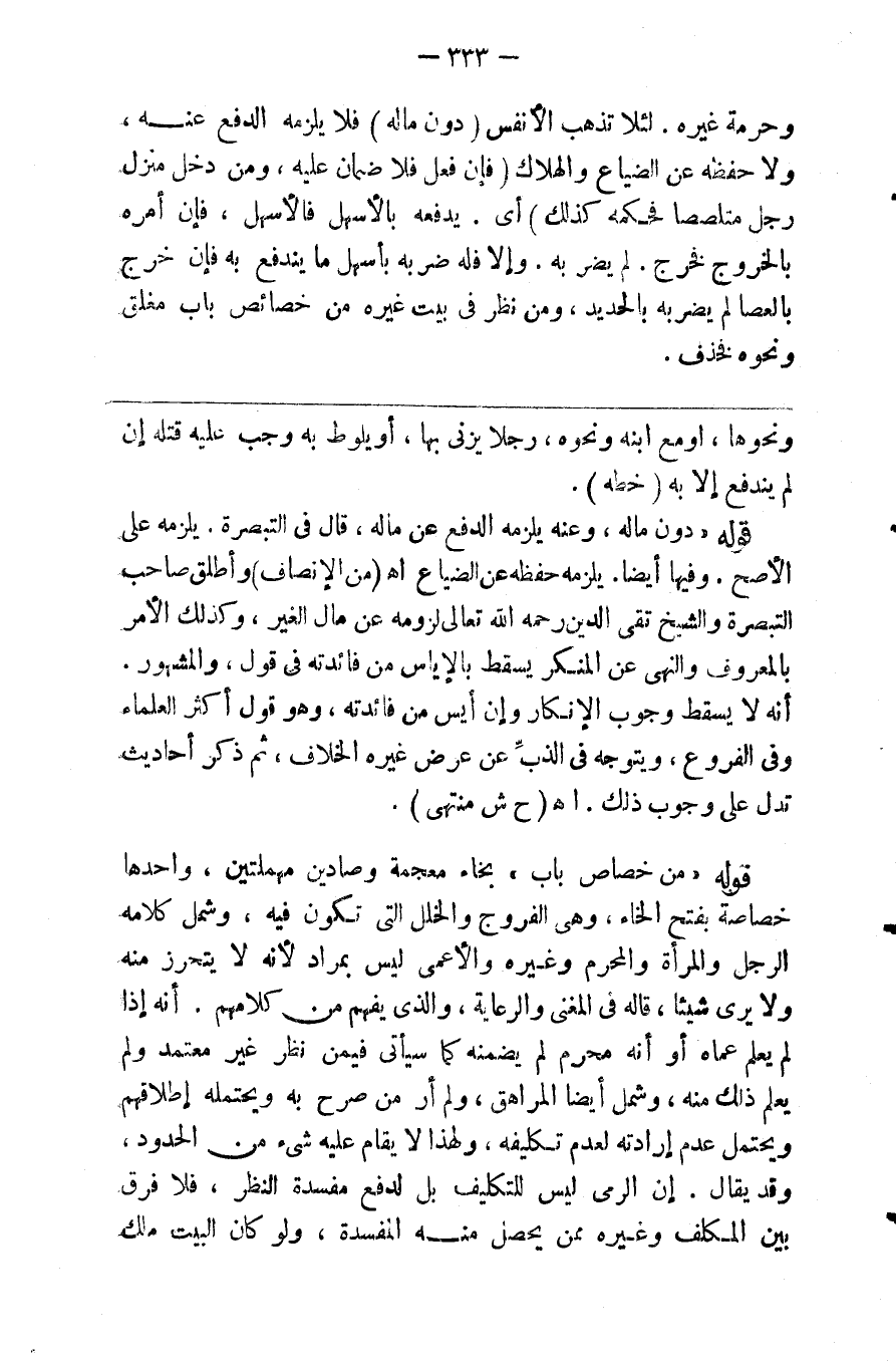 وحرمة غيره لئلا تذهب الأنفس ( دون ماله ) فلا يلزمه الدفع عنه ولا حفظه عن الضياع والهلاك فإن فعل فلا ضمان عليه ( ومن دخل منزله رجل متلصصا فحكمه كذلك ) أي يدفعه بالأسهل فإن أمره بالخروج فخرج كذلك لم يضربه وإلا فله ضربه بأسهل مايندفع به فإن خرج بالعصا لم يضربه بالحديد ومن نظر في بيت غيره من خصاص باب مغلق ونحوه فحذف