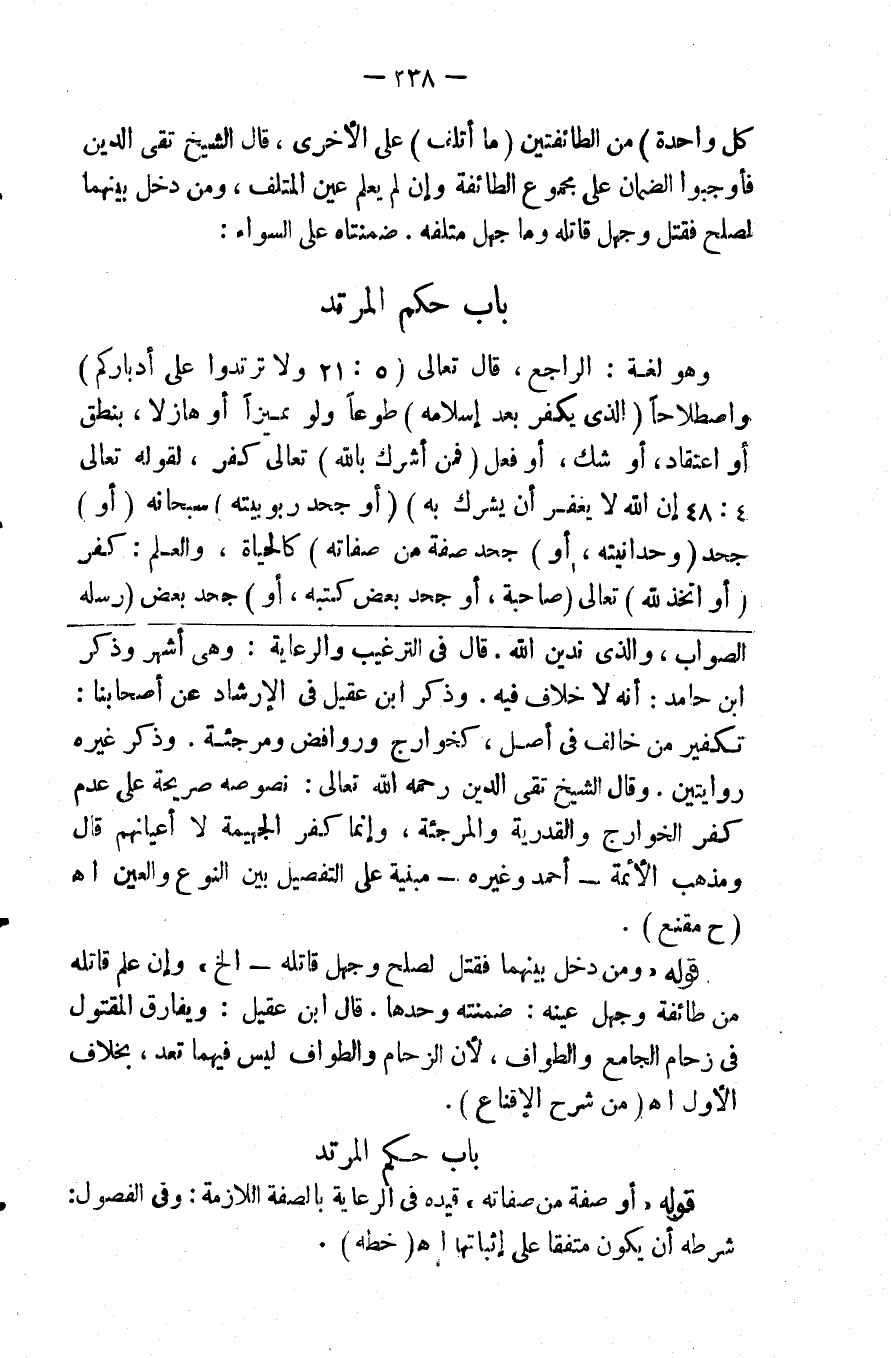 (وهو) لغة الراجع قال تعالى {ولا ترتدوا على أدباركم} واصطلاحا (الذي يكفر بعد إسلامه) طوعا ولو مميزا أو هازلا بنطق أو اعتقاد أو شك أو فعل (فمن أشرك بالله) تعالى كفر لقوله تعالى {إن الله لا يغفر أن يشرك به} أو جحد ربوبيته سبحانه (أو) جحد (وحدانيته أو) جحد (صفه من صفاته) كالحياة والعلم كفر (أو اتخذ لله) تعالى (صاحبة أو ولدا أو جحد بعض كتبه أو) جحد بعض (رسل