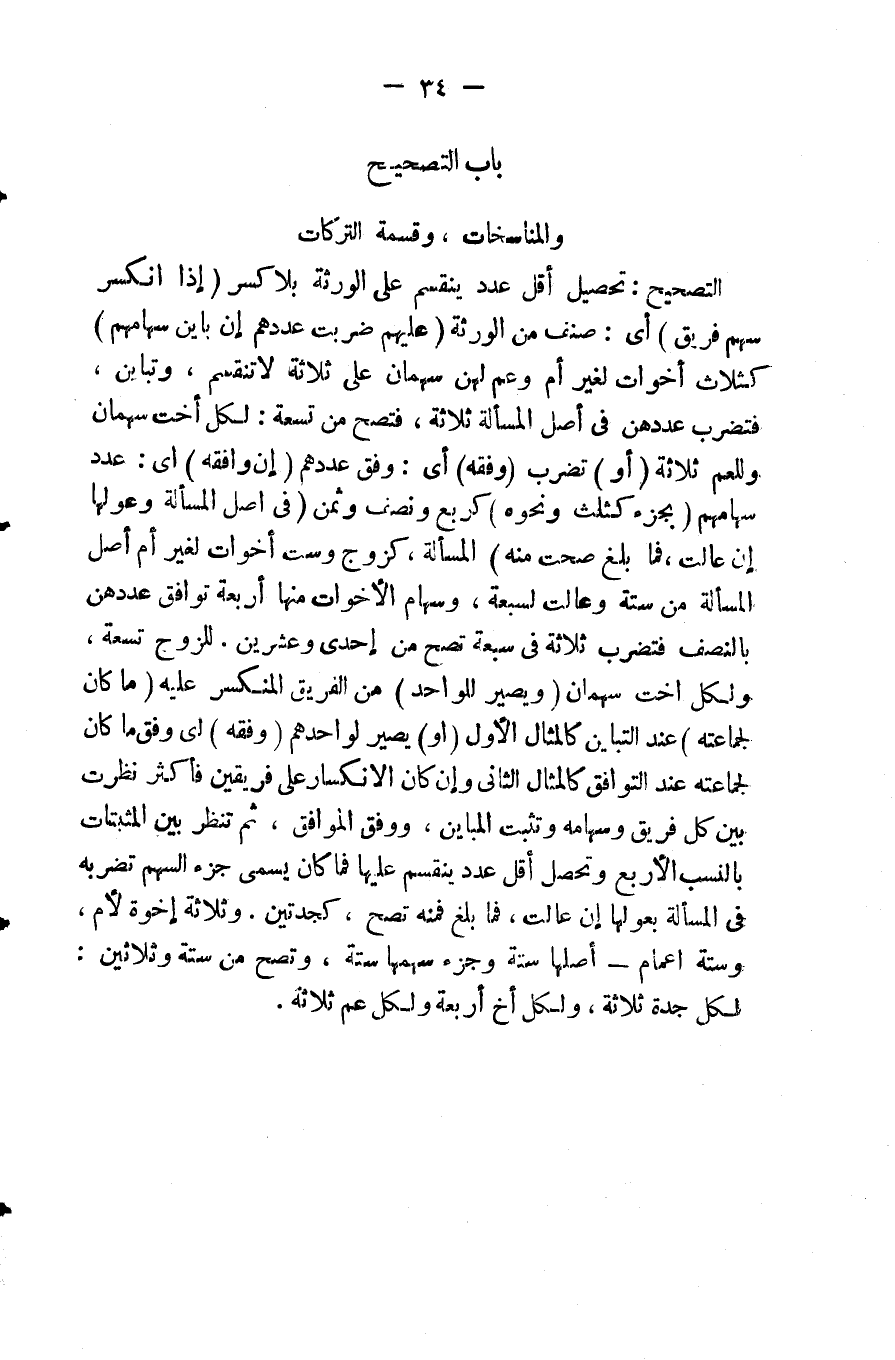 التصحيح تحصيل أقل عدد ينقسم على الورثة بلا كسر ( إذا انكسر سهم فريق ) أي صنف من الورثة ( عليهم ضربت عددهم إن باين سهامهم ) كثلاث أخوات لغير أم وعم لهن سهمان على ثلاثة لا تنقسم وتباين فتضرب عددهن في أصل أخت المسألة فتصح من تسعة لكل أخت سهمان وللعم ثلاثة ( أو ) تضرب ( وفقه ) أي وفق عددهم ( إن وافقه ) أي عدد سهامهم ( بجزء كثلث ونحوه ) كربع ونصف وثمن ( في أصل المسألة وعولها إن عالت فما بلغ صحت منه ) المسألة كزوج وست أخوات لغير أم أصل المسألة من ستة وعالت لسبعة وسهام الأخوات منها أربعة توافق عددهن بالنصف فتضرب ثلاثة في سبعة تصح من إحدى وعشرين للزوج تسعة ولكل أخت سهمان ( ويصير للواحد ) من الفريق المنكسر عليه ( ما كان لجماعته ) عند التباين كالمثال الأول ( أو ) يصير لواحدهم ( وفقه ) أي وفق ماكان لجماعته عند التوافق كالمثال الثاني وإن كان الانكسار على فريقين فأكثر نظرت بين كل فريق وسهامه وتثبت المباين ووفق الموافق ثم تنظر بين المثبتات بالنسب الأربع وتحصل أقل عدد ينقسم عليها فما كان يسمى جزء السهم تضربه في المسألة بعولها إن عالت فما بلغ فمنه تصح كجدتين وثلاثة إخوة لأم وستة أعمام أصلها ستة وجزء سهمها ستة وتصح من ستة وثلاثين لكل جدة ثلاثة ولكل أخ أربعة ولكل عم ثلاثة %