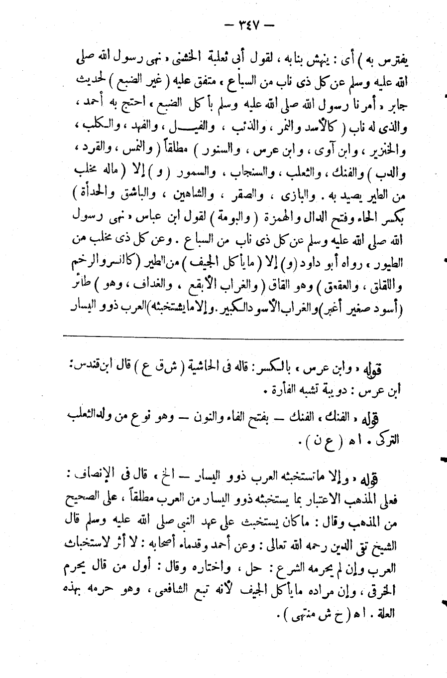يفترس به) أي ينهش بنابه لقول أبي ثعلبه الخشني نهي رسول الله صلى الله عليه وسلم عن كل ذي ناب من السباع متفق عليه (غير الضبع) لحديث جابر أمرنا رسول الله صلى الله عليه وسلم بأكل الضبع احتج به أحمد والذي له ناب (كالأسد والنمر والذئب والفيل والفهد والكلب والخنزير وابن آوى وابن عرس والسنور) مطلقا (والنمس والقرد والدب) والفنك والثعلب والسنجاب والسمور (و) إلا (ماله مخلب من الطير يصيد به كالعقاب والبازي والصقر والشاهين والباشق والحدأة) بكسر الحاء وفتح الدال والهمزة (والبومة) لقول ابن عباس نهى رسول الله صلى الله عليه وسلم عن كل ذي ناب من السباع وعن كل ذي مخلب من الطيور رواه أبو داود (و) إلا (ما يأكل الجيف) من الطير (كالنسر والرخم واللقلق والعقعق) وهو القاق (والغراب الأبقع والخطاف وهو) طائر (أسود صغير أغبر والغراب الأسود الكبير و) إلا (مايستخبثه) العرب ذوو اليسار