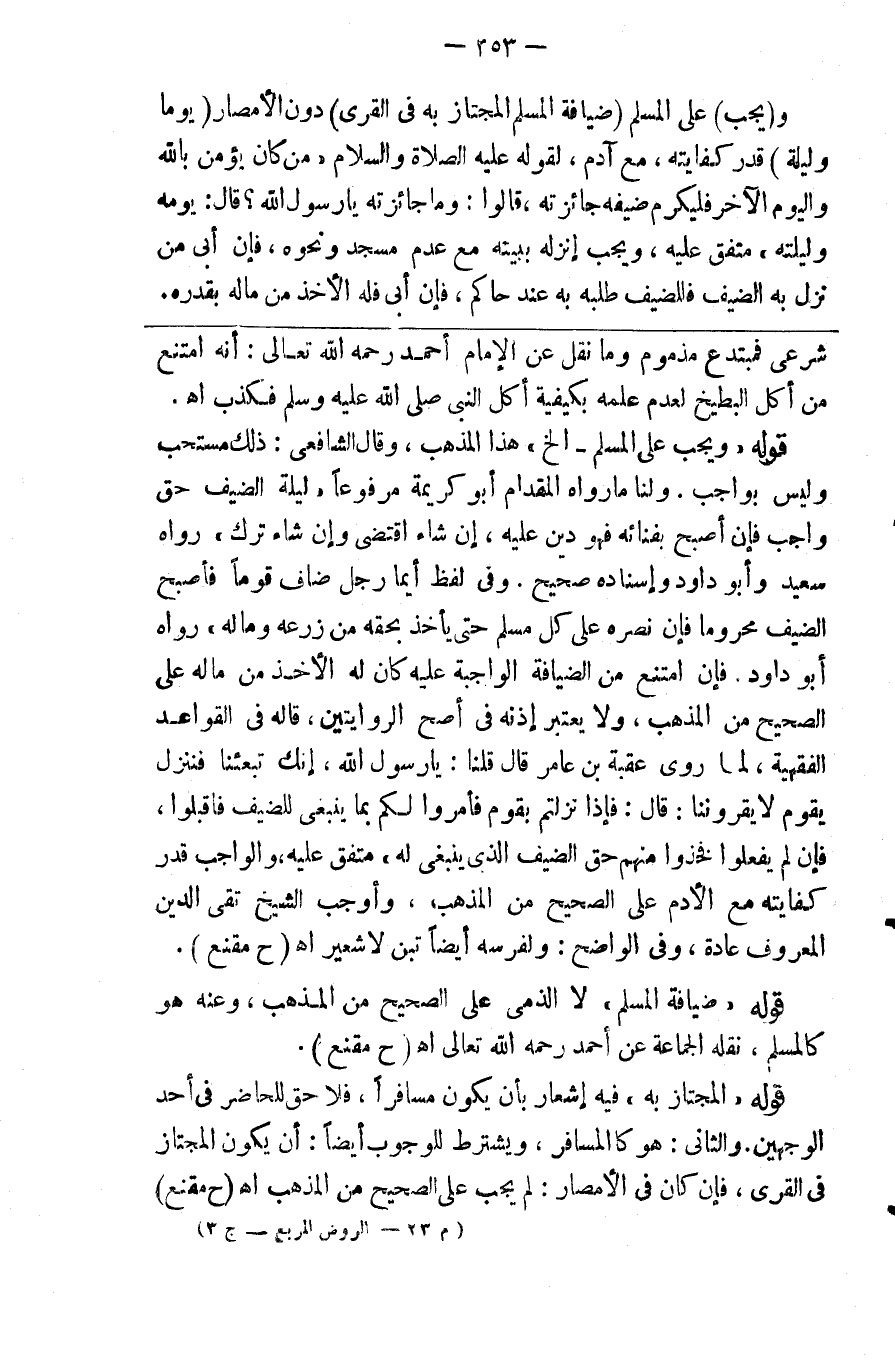 ( ويجب ) على المسلم ( ضيافة المسلم المجتاز به في القرى ) دون الأمصار ( يوما وليلة ) قدر كفايته مع آدم لقوله صلى الله عليه وسلم من كان يؤمن بالله واليوم الآخر فليكرم ضيفه جائزته قالوا وما جائزته يا رسول الله قال يومه وليلته متفق عليه ويجب إنزاله ببيته مع عدم مسجد ونحوه فإن أبى من نزل به الضيف فللضيف طلبه به عند حاكم فإن أبى فله الأخذ من ماله بقدره