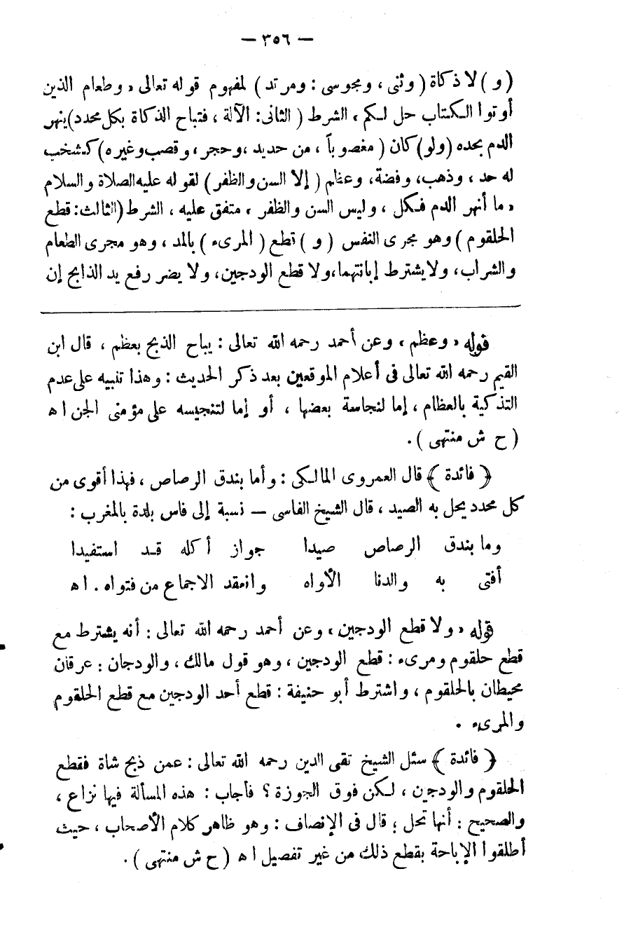 ( و ) لا ذكاة حل لكم الشرط ( الثاني الآلة فتباح الذكاة بكل محدد ) ينهر الدم بحده ( ولو ) كان ( مغصوبا من حديد وحجر وقصب وغيره ) كخشب له حد وذهب وفضة وعظم ( إلا السن والظفر ) لقوله صلى الله عليه وسلم ما أنهر الدم فكل ليس السن والظفر متفق عليه الشرط ( الثالث قطع الحلقوم ) وهو مجرى النفس ( و ) قطع ( المريء ) بالمد وهو مجرى الطعام والشراب ولا يشترط إبانتهما ولا قطع الودجين ولا يضر رفع يد الذابح إن