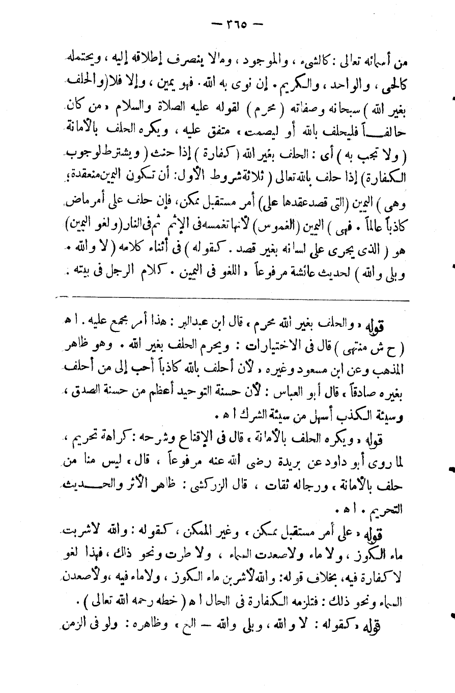 من أسمائه تعالى كالشيء والموجود وما لا ينصرف إطلاقه إليه ويحتمله كالحي والواحد والكريم إن نوى به الله فهو يمين وإلا فلا ( والحلف بغير الله ) سبحانه وصفاته ( محرم ) لقوله صلى الله عليه وسلم فمن كان حالفا فليحلف بالله أو ليصمت متفق عليه ويكره الحلف بالأمانه ( ولا تجب به ) أي بالحلف بغير الله ( كفارة ) إذا حنث ( ويشترط لوجوب الكفارة ) إذا حلف بالله تعالى ( ثلاثة شروط ) ( الأول أن تكون اليمين منعقدة وهي ) اليمين ( التي قصد عقدها على ) أمر ( مستقبل ممكن فإن حلف على أمر ماض كاذبا عالما فهي ) اليمين ( الغموس ) لأنها تغمسه في الإثم ثم في النار ( ولغو اليمين ) هو ( الذي يجري على لسانه بغير قصد كقوله ) في أثناء كلامه ( لا والله وبلى والله ) لحديث عائشة مرفوعا اللغو في اليمين كلام الرجل في بيته