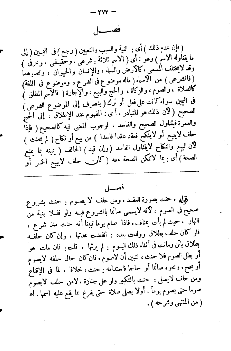 (فإن عدم ذلك) أي النية والسبب والتعين (رجع) في اليمين (إلى ما يتناوله الاسم وهو) أي الاسم (ثلاثة شرعي وحقيقي وعرفي) وقد لايختلف المسمى كالأرض والسماء والإنسان والحيوان ونحوها (فالشرعي) من الأسماء (ماله موضوع في الشرع وموضوع في اللغة) كالصلاة والصوم والزكاة والحج والبيع والإجارة فالاسم (المطلق) في اليمين سواء كانت على فعل أو ترك (ينصرف إلى الموضوع الشرعي الصحيح) لأن ذلك هو المتبادر إلى الفهم عند الإطلاق إلا الحج والعمرة فيتناول الصحيح والفاسد لوجوب المضي فيه كالصحيح (فإذا حلف لايبيع أو لا ينكح فعقد عقدا فاسدا) من بيع أو نكاح (لم يحنث) لأن البيع والنكاح لا يتناول الفاسد (وإن قيد) الحالف (يمينه بما يمنع الصحة) أي بما لا تمكن الصحة معه (كأن حلف لايبيع الخمر أو
