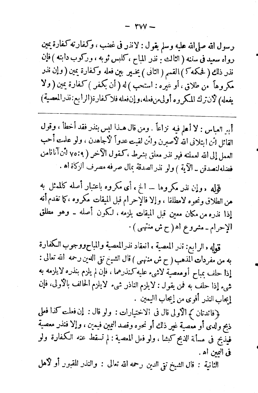 رسول الله صلى الله عليه وسلم يقول لا نذر في غضب وكفارته كفارة يمين رواه سعيد في سنته ( الثالث نذر المباح كلبس ثوبه وركوب دابته ) فإن نذر ذلك ( فحكمه ك ) القسم ( الثاني ) يخير بين فعله وكفارة يمين ( وإن نذر مكروها من طلاق أو غيره استحب له ( أن يكفر ) كفارة يمين ( ولا يفعله ) لأن ترك المكروه أولى من فعله وإن فعله فلا كفارة ( الرابع نذر المعصية