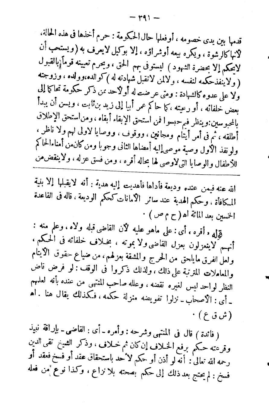 قدمها بين يدي خصومه أو فعلها حال الحكومة حرم أخذها في هذه الحالة لأنها كالرشوة ويكره بيعه وشراؤه إلا بوكيل لا يعرف به ( ويستحب أن لا يحكم إلا بحضرة الشهود ) ليستوفي بهم الحق ويحرم تعيينه قوما بالقبول ( ولا ينفذ حكمه لنفسه ولا لمن لا تقبل شهادته له ) كوالده وولده وزوجته ولا على عدوه كالشهادة ومتى عرضت له أو لأحد ممن ذكر حكومة تحاكما إلى بعض خلفائه أو رعيته كما حاكم عمر أبيا إلى زيد بن ثابت ويسن أن يبدأ بالمحبوسين وينظر فيم حبسوا فمن استحق الإبقاء أبقاه ومن استحق الإطلاق أطلقه ثم في أمر أيتام ومجانين ووقوف ووصايا لا ولي لهم ولا ناظر ولو نفذ الأول وصية موصى إليه أمضاها الثاني وجوبا ومن كان من أمناء الحاكم للأطفال والوصايا التي لا وصي لها بحالة أقره ومن فسق عزله ولا ينقض من