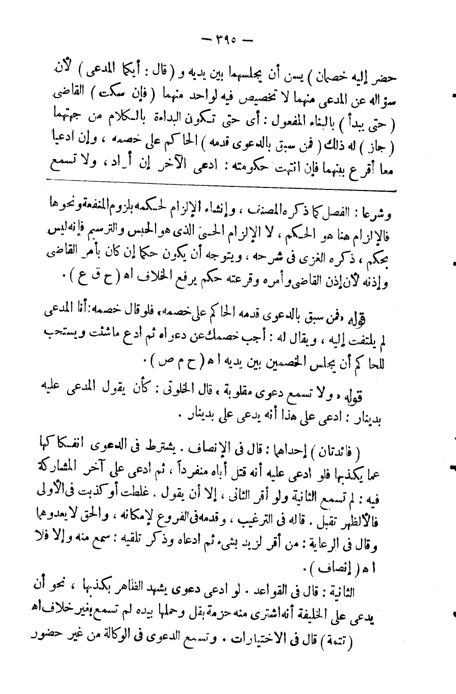 حضر إليه خصمان ) يسن أن يجلسهما بين يديه و ( قال أيكما المدعي ) لأن سؤاله عن المدعي منهما لا تخصيص فيه لواحد منهما ( فإن سكت ) القاضي ( حتى يبدأ ) بالبناء للمفعول أي حتى تكون البدأة بالكلام من جهتهما ( جاز ) له ذلك ( فمن سبق بالدعوى قدمه ) الحاكم على خصمه وإن ادعيا معا أقرع بينهما فإذا انتهت حكومته ادعى الآخر إن أراد ولا تسمع