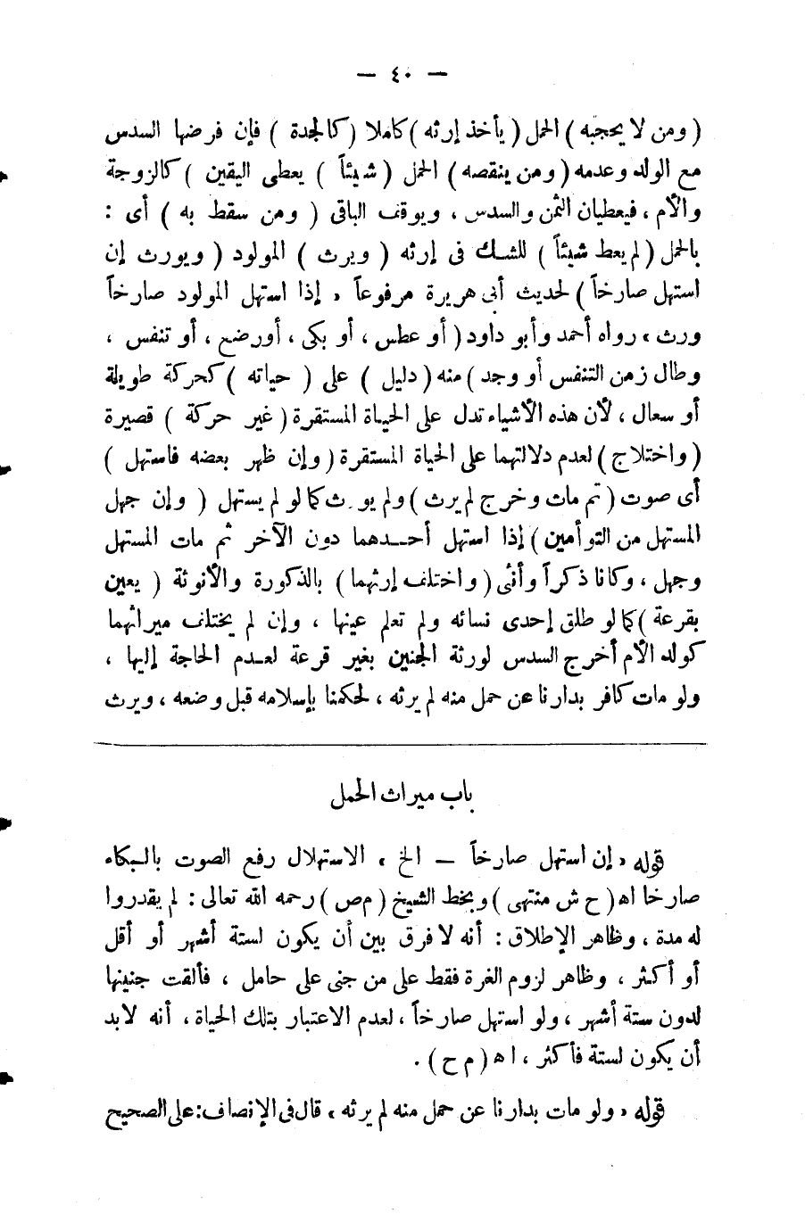 ( ومن لا يحجبه ) الحمل ( يأخذ إرثه كاملا ( كالجدة ) فإن فرضها السدس مع الولد وعدمه ( ومن ينقصه ) الحمل ( شيئا ) يعطى ( اليقين ) كالزوجة والأم فيعطيان الثمن والسدس ويوقف الباقي ( ومن سقط به ) أي بالحمل ( لم يعط شيئا ) للشك في إرثه ( ويرث ) المولود ( ويورث إن استهل صارخا ) لحديث أبي هريرة مرفوعا إذا استهل المولود صارخا ورث رواه أحمد وأبو داود ( أو عطس أو بكى أو رضع أو تنفس وطال زمن التنفس أو وجد ) منه ( دليل ) على ( حياته ) كحركة طويلة أو سعال لأن هذه الأشياء تدل على الحياة المستقرة ( غير حركة ) قصيرة ( واختلاج ) لعدم دلالتها على الحياة المستقرة وإن ظهر بعضه فاستهل ) أي صوت ( ثم خرج ومات لم يرث ) ولم يورث كما لو لم يستهل ( وإن جهل المستهل من التوأمين ) إذا استهل أحدهما دون الآخر ثم مات المستهل وجهل وكانا ذكرا وأنثى ( واختلف إرثهما ) بالذكورة والأنوثة ( يعين بقرعة ) كما لو طلق إحدى نسائه ولم تعلم عينها وإن لم يختلف ميراثهما كولد الأم أخرج السدس لورثة الجنين بغير قرعة لعدم الحاجة إليها ولو مات كافر بدارنا عن حمل منه لم يرثه لحكمنا بإسلامه قبل وضعه ويرث