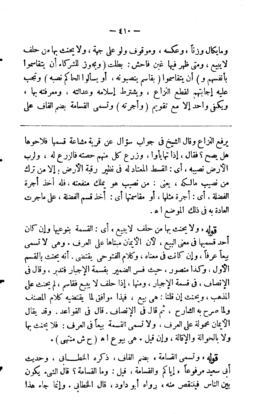 يكال وزنا وعكسه وموقوف ولو على جهة ولا يحنث بها من حلف لا يبيع ومتى ظهر فيها غبن فاحش بطلت ( ويجوز للشركاء أن يتقاسموا بأنفسهم و ) أن يتقاسموا ( بقاسم ينصبونه أو يسألوا الحاكم نصبه ) وتجب عليه إجابتهم لقطع النزاع ويشترط إسلامه وعدالته ومعرفته بها ويكفي واحد إلا مع تقويم ( وأجرته وتسمى القسامة بضم القاف على