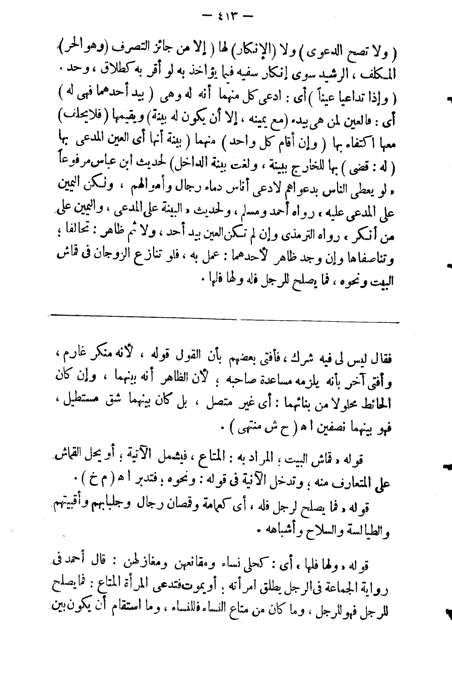 ( ولا تصح الدعوى و ) لا ( الإنكار ) لها ( إلا من جائز التصرف ) وهو الحر المكلف الرشيد سوى إنكار سقيه فيما يؤاخذ به لو أقر به كطلاق وحد ( وإذا تداعيا عينا ) أي ادعى كل منهما أنها له وهي ( بيد أحدهما فهي له ) أي فالعين لمن هي بيده ( مع يمينه إلا أن يكون له بينة ) ويقيمها ( فلا يحلف ) معها اكتفاء بها ( وإن أقام كل واحد ) منهما ( بينة أنها ) أي العين المدعى بها ( له قضي ) بها ( للخارج ببينته ولغت بينة الداخل ) لحديث ابن عباس مرفوعا لو يعطى الناس بدعواهم لا دعى أناس دماء رجال وأموالهم ولكن اليمين على المدعى عليه رواه أحمد ومسلم ولحديث البينة على المدعي واليمين على من أنكر رواه الترمذي وإن لم تكن العين بيد أحد ولا ثم ظاهر تحالفا وتناصفاها وإن وجد ظاهر لأحدهما عمل به فلو تنازع الزوجان في قماش البيت ونحوه فما يصلح لرجل فله ولها فلها