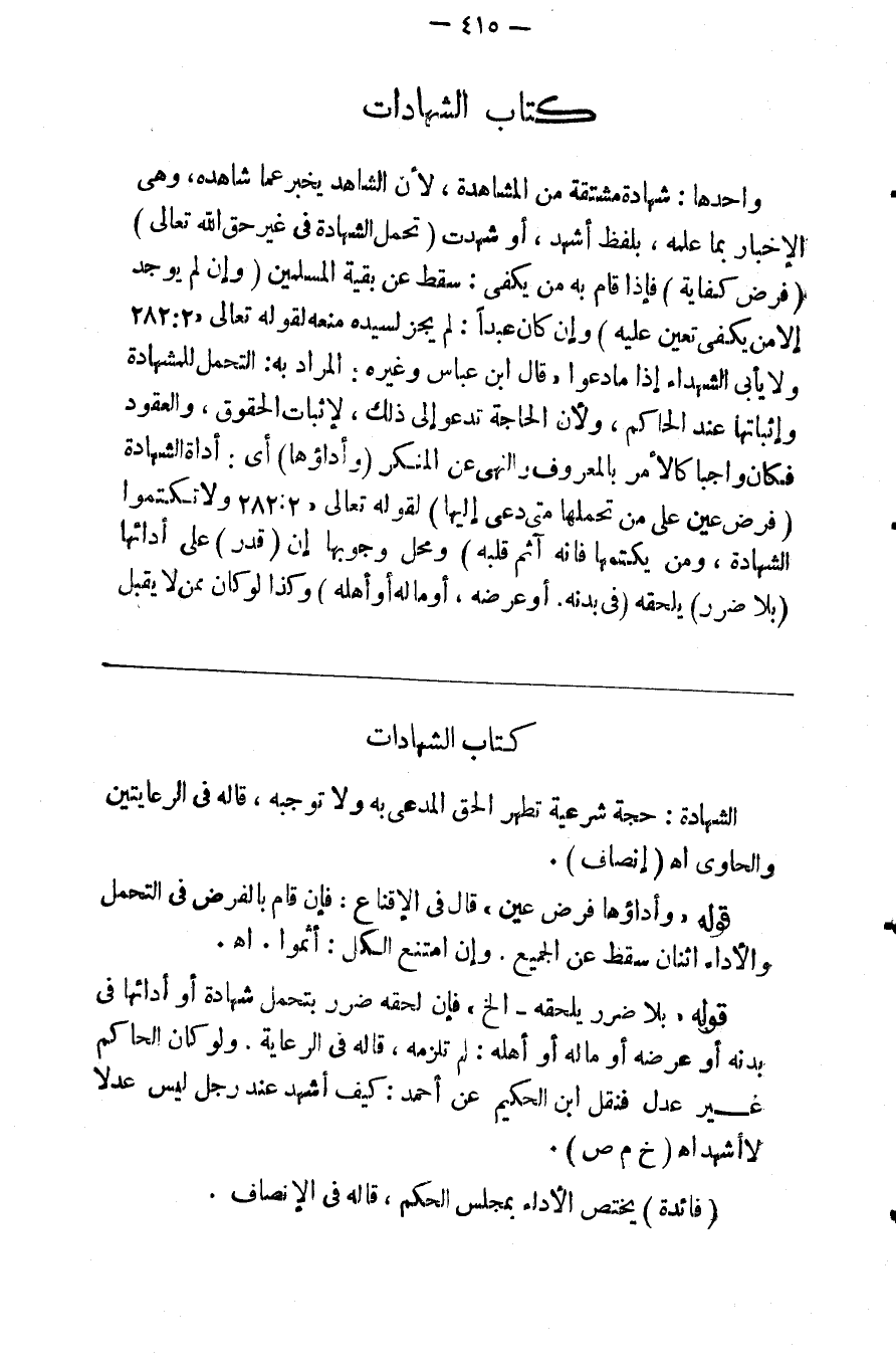 واحدتها شهادة مشتقة من المشاهدة لأن الشاهد يخبر عما شاهده وهي الإخبار بما علمه بلفظ أشهد أو شهدت (وتحمل الشهادة في غير حق الله) تعالى (فرض كفاية) فإذا قام به من يكفي سقط عن بقية المسلمين و (إن لم يوجد إلا من يكفي تعين عليه) وإن كان عبدا لم يجز لسيده منعه لقوله تعالى {ولا يأب الشهداء إذا ما دعوا} قال ابن عباس وغيره المراد به التحمل للشهادة وإثباتها عند الحاكم ولأن الحاجة تدعو إلى ذلك لإثبات الحقوق والعقود فكان واجبا كالأمر بالمعروف والنهي عن المنكر (وأداؤها) أي أداء الشهادة (فرض عين على من تحملها متى دعي إليها) لقوله تعالى {ولا تكتموا الشهادة ومن يكتمها فإنه آثم قلبه} و محل وجوبها إن (قدر) على أدائها (بلا ضرر) يلحقه (في بدنه أو عرضه أو ماله أو أهله) وكذا لو كان ممن لا يقبل