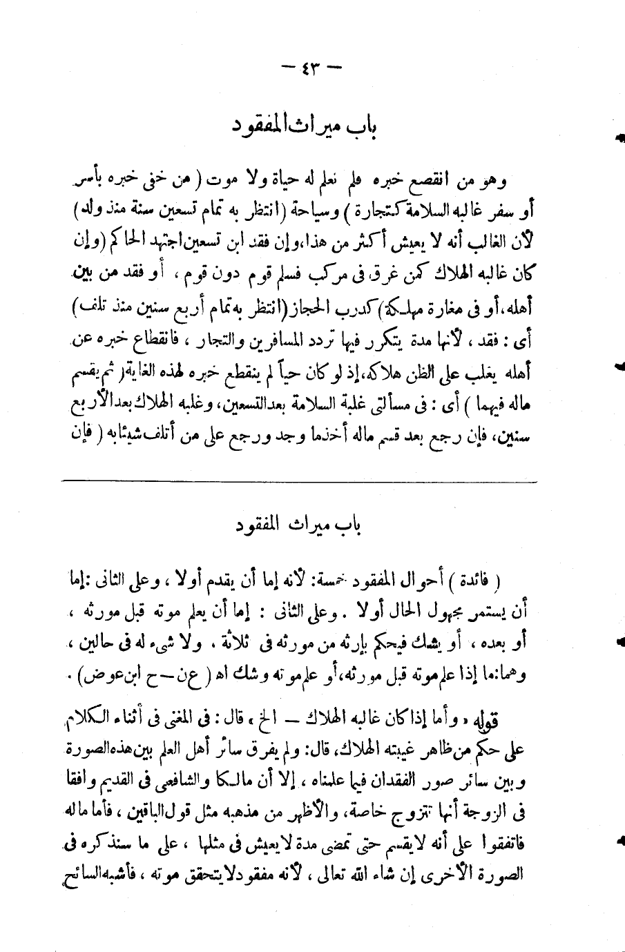 باب ميراث المفقود وهو من انقطع خبره فلم تعلم له حياة ولا موت ( من خفي خبره بأسر أو سفر غالبه السلامة كتجارة ) وسياحة ( انتظر به تمام تسعين سنه منذ ولد ) لأن الغالب أنه لا يعيش أكثر من هذا وإن فقد ابن تسعين اجتهد الحاكم ( وإن كان غالبه الهلاك كمن غرق في مركب فسلم قوم دون قوم أو فقد من بين أهله أو في مغازة مهلكة ) كدرب الحجاز ( انتظر به تمام أربع سنين منذ تلف ) أي فقد لأنها مدة يتكرر فيها تردد المسافرين والتجار فانقطاع خبره عن أهله يغلب على الظن هلاكه إذ لو كان حيا لم ينقطع خبره إلى هذه الغاية ( ثم يقسم ماله فيهما ) أي في مسألتي غلبة السلامة بعد التسعين وغلبة الهلاك بعد الأربع سنين فإن رجع بعد قسم ماله أخذ ما وجد ورجع على من أتلف شيئا به ( فإن