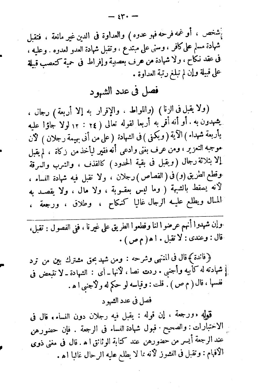 (ولا يقبل في الزنا) واللواط (والإقرار به إلا أربعة) رجال يشهدون به أو أنه أقر به أربعا لقوله تعالى {لولا جاؤوا عليه بأربعة شهداء} الآية (ويكفي) في الشهادة (على من أتى بهيمة رجلان) لأن موجبه التعزير ومن عرف بغنى وادعى أنه فقير ليأخذ من الزكاة لم يقبل إلا بثلاثة رجال (ويقبل في بقية الحدود) كالقذق والشرب والسرقة وقطع الطريق (و) في (القصاص) رجلان ولا تقبل فيه شهادة النساء لأنه يسقط بالشبهة (وما ليس بعقوبة ولا مال ولا يقصد به المال ويطلع عليه الرجال غالبا فيه رجلان) دون النساء (ويقبل في المال وملا يقصد به) المال (كالبيع والأجل والخيار فيه) أي في البيع (ونحوه) كالقرض والرهن والغضب والإجارة والشركة والشفعة وضمان المال وإتلافه والعتق والكتابة والتدبير والوصية بالمال والجناية إذا لم توجب قودا ودعوى أسير تقدم إسلامه لمنع رقه (رجلان أو رجل وامرأتان) لقوله تعالى فإن كنكاح وطلاق ورجع
