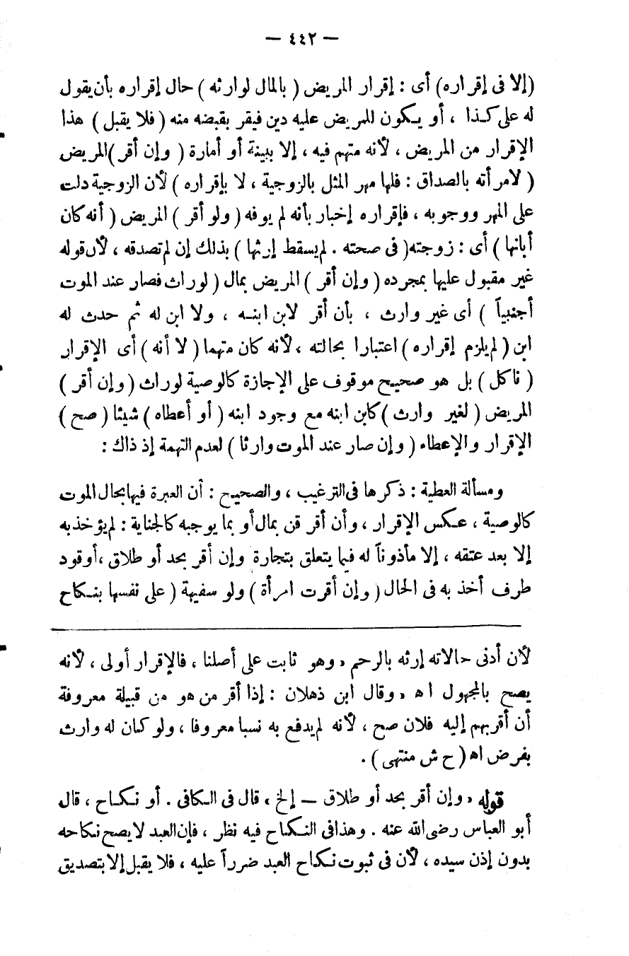 ( إلا في إقراره ) أي إقرار المريض ( بالمال لوارثه ) حال إقراره بأن يقول له علي كذا أو يكون للمريض عليه دين فيقر بقبضه منه ( فلا يقبل ) هذا الإقرار من المريض لأنه متهم فيه إلا ببينة أو إجارة ( وإن أقر ) المريض ( لامرأته بالصداق فلها مهر المثل بالزوجيه لا بإقراره ) لأن الزوجية دلت على المهر ووجوبه فإقراره إخبار بأنه لم يوفه ( ولو أقر ) المريض ( أنه كان أبانها ) أي زوجته ( في صحته لم يسقط إرثها ) بذلك إن لم تصدقه لأن قوله غير مقبول عليها بمجرده ( وإن أقر ) المريض بمال ( لوارث فصار عند الموت أجنبيا ) أي غير وارث بأن أقر لابن ابنه ولا ابن له ثم حدث له ابن ( لم يلزم إقراره ) اعتبارا بحالته لأنه كان متهما ( لا أنه ) أي الإقرار ( باطل ) بل هو صحيح موقوف على الإجازة كالوصية لوارث ( وإن أقر ) المريض ( لغير وارث ) كابن ابنه مع وجود ابنه ( أو أعطاء ) شيئا ( صح ) الإقرار والإعطاء ( وإن صار عند الموت وارثا ) لعدم التهمة إذ ذاك ومسألة العطية ذكرها في الترغيب و الصحيح أن العبرة فيها بحال الموت كالوصية عكس الإقرار وإن أقر قن بمال أو بما يوجبه كالجناية لم يؤ خذ به إلا بعد عتقه إلا مأذونا له فيما يتعلق بتجارة وإن أقر بحد أو طلاق أو قود طرف أخذ به في الحال ( وإن أقرب امرأة ) ولو سفيهة ( على نفسها بنكاح