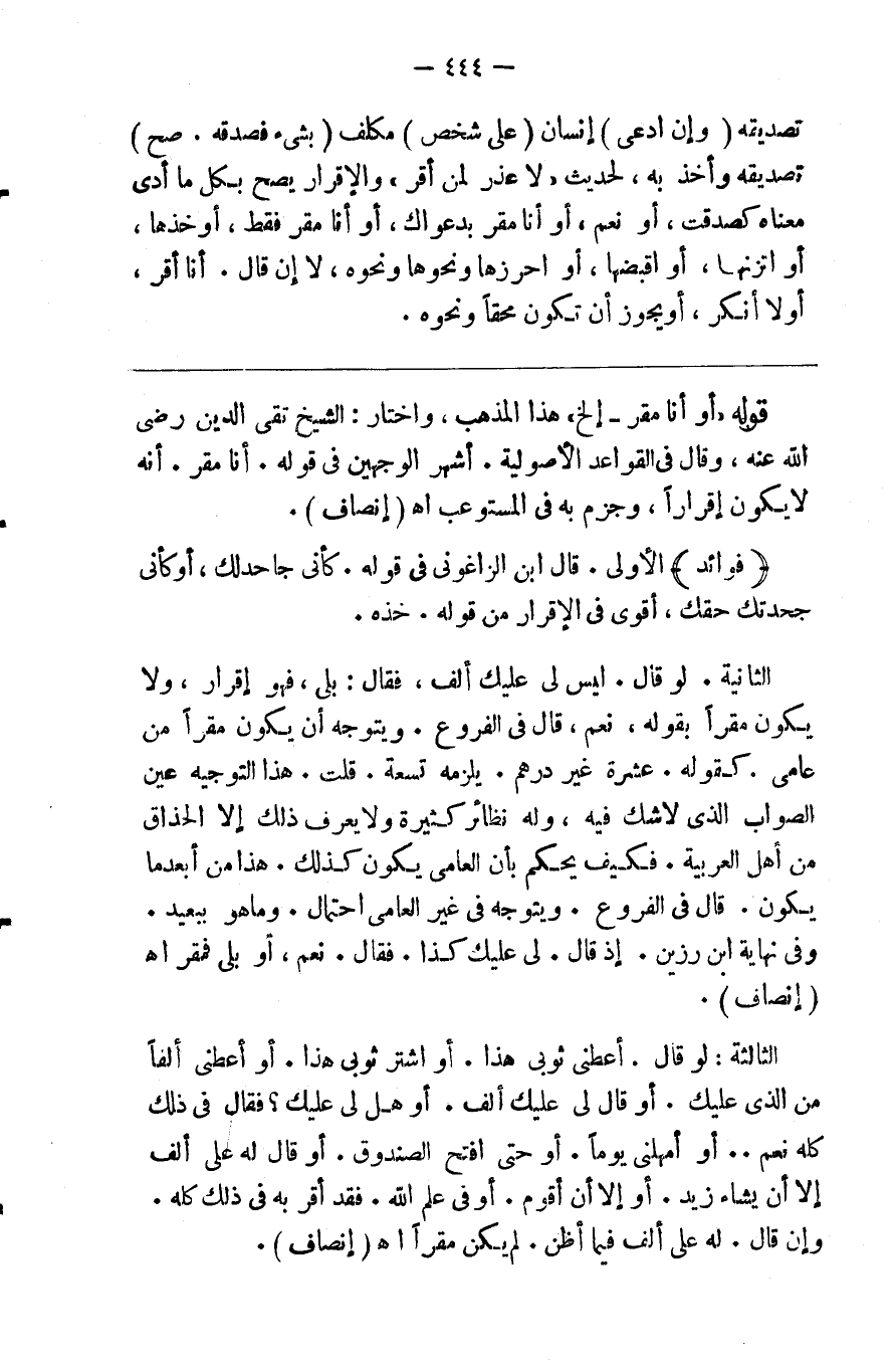 تصديقه ( وإن ادعى ) إنسان ( على شخص ) مكلف ( بشيء فصدقه صح ) تصديقه وأخذ به لحديث لاعذر لمن أقر والإقرار يصح بكل ما أدى معناه كصدقت أو نعم أو أنا مقر بدعواك أو أنا مقر فقط أو أخذها أو اتزنها أو قبضها أو أحرزها ونحوه لا إن قال أنا أقر أو لا أنكر أو يجوز أن تكون محقا ونحوه %