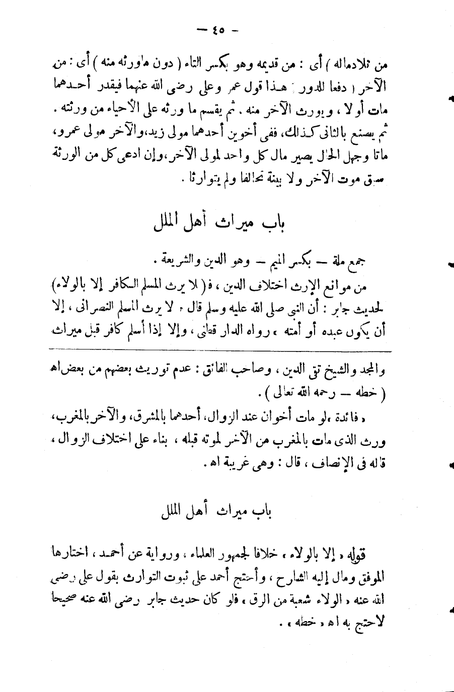 جمع ملة بكسر الميم وهي الدين والشريعة من موانع الإرث اختلاف الدين ف ( فلا يرث المسلم الكافر إلا بالولاء ) لحديث جابر أن النبي صلى الله عليه وسلم قال لا يرث المسلم النصراني إلا أن يكون عبده أو أمته رواه الدارقطني وإلا إذا أسلم كافر قبل قسم ميراث