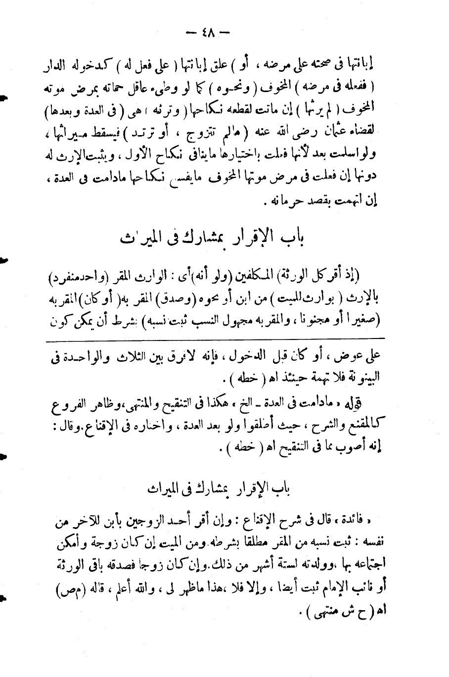 إبانتها في صحته على مرضه أو ) علق إبانتها ( على فعل له ) كدخوله الدار ( ففعله في مرضه ) المخوف ( ونحوه ) كما لو وطئ عاقل حماته بمرض موته المخوف ( لم يرثها ) إن ماتت لقطعه نكاحها ( وترثه ) هي ( في العدة وبعدها ) لقضاء عثمان رضي الله عنه ( ما لم تتزوج أو ترتد ) فيسقط ميراثها ولو أسلمت بعد لأنها فعلت باختيارها ما ينافي نكاح الأول ويثبت الإرث له دونها إن فعلت في مرض موتها المخوف ما يفسخ نكاحها مادامت في العدة إن اتهمت بقصد حرمانه 10 باب الاقرار بمشارك في الميراث