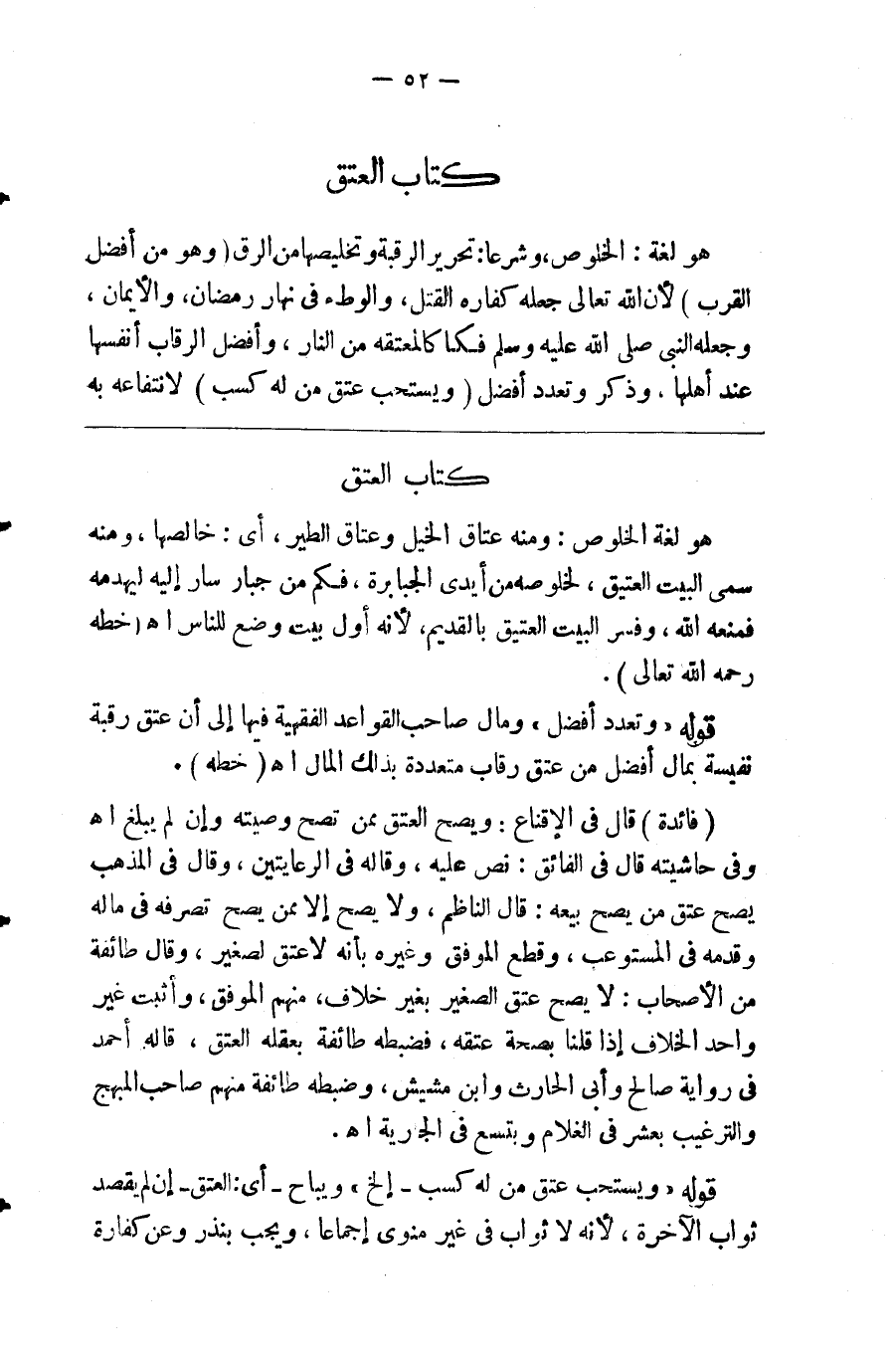 هو لغة الخلوص وشرعا تحرير الرقبة وتخليصها من الرق (وهو من أفضل القرب) لأن الله تعالى جعله كفارة للقتل والوطء في نهار رمضان والأيمان وجعله النبي صلى الله عليه وسلم فكاكا لمعتقه من النار وأفضل الرقاب أنفسها عند أهلها وذكر وتعدد أفضل (ويستحب عتق من له كسب) لانتفاعه به