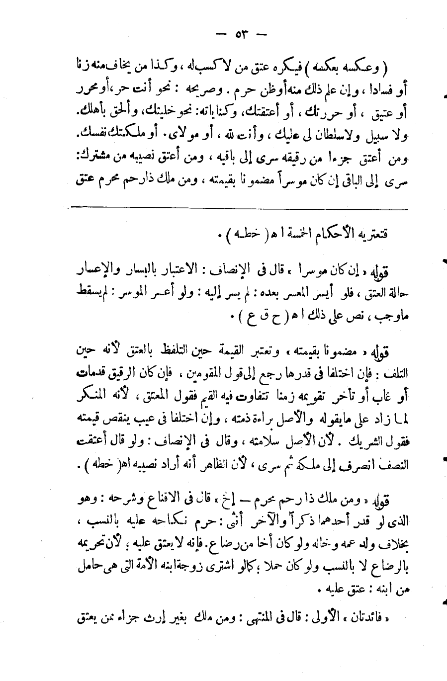 (وعكسه بعكسه) فيكره عتق من لا كسب له وكذا من يخاف منه زنا أو فسادا وإن علم ذلك منه أو ظن حرم وصريحه نحو أنت حر أو محرر أوعتيق أو معتق أو حررتك أو أعتقك وكناياته نحو خليتك والحق بأهلك ولا سبيل ولا سلطان لي عليك وأنت لله أو مولاي وملكتك نفسك ومن أعتق جزءا من رقيقه سرى إلى باقيه ومن أعتق نصيبه من مشترك سرى إلى الباقي إن كان موسرا مضمونا بقيمته ومن ملك ذا رحم محرم عتق عليه