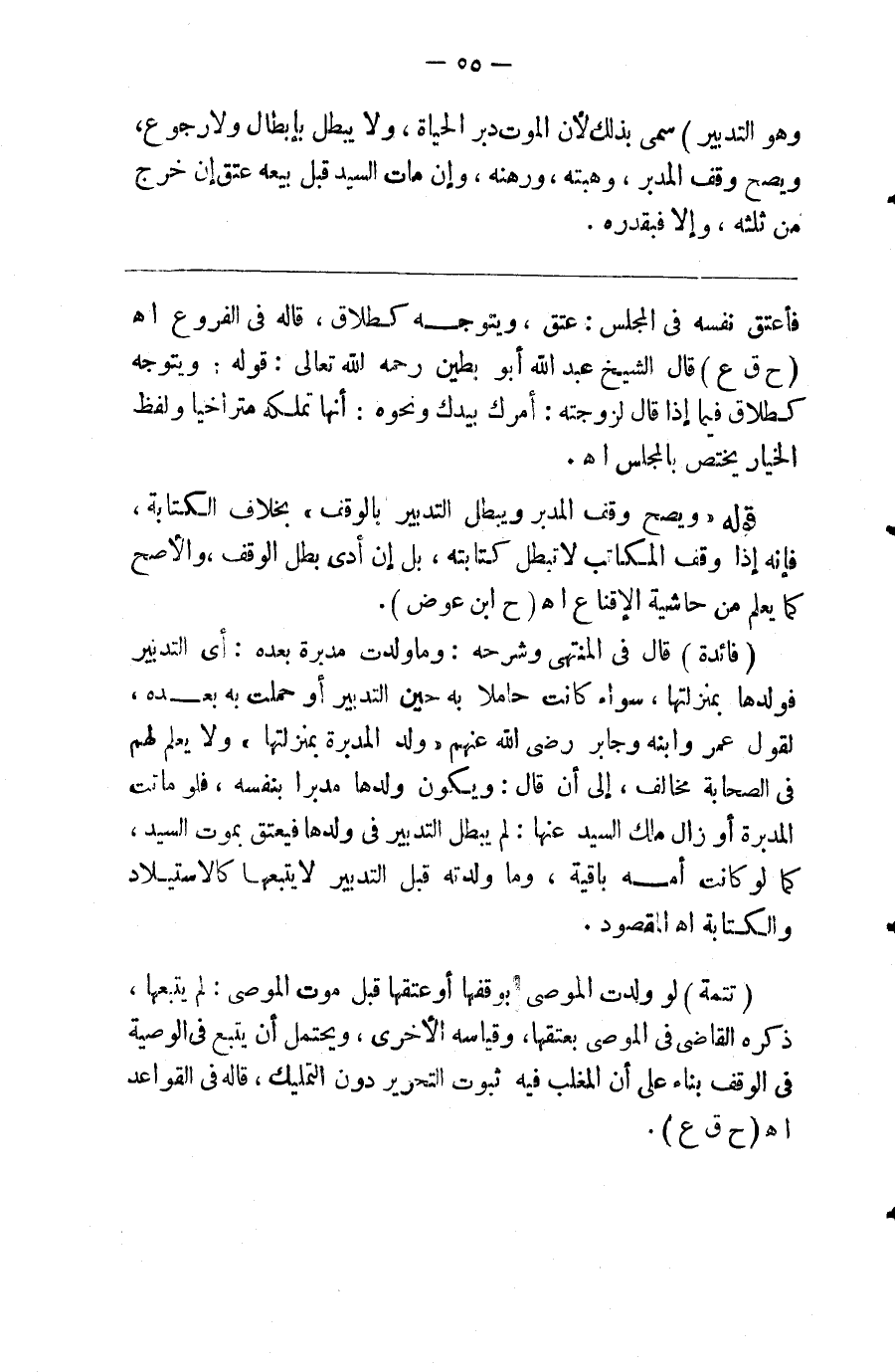 وهو التدبير ) سمي بذلك لأن الموت دبر الحياة ولا يبطل بإبطال ولا رجوع ويصح وقف المدبر وهبته وبيعه ورهنه وإن مات السيد قبل بيعه عتق إن خرج من ثلثه وإلا فبقدره