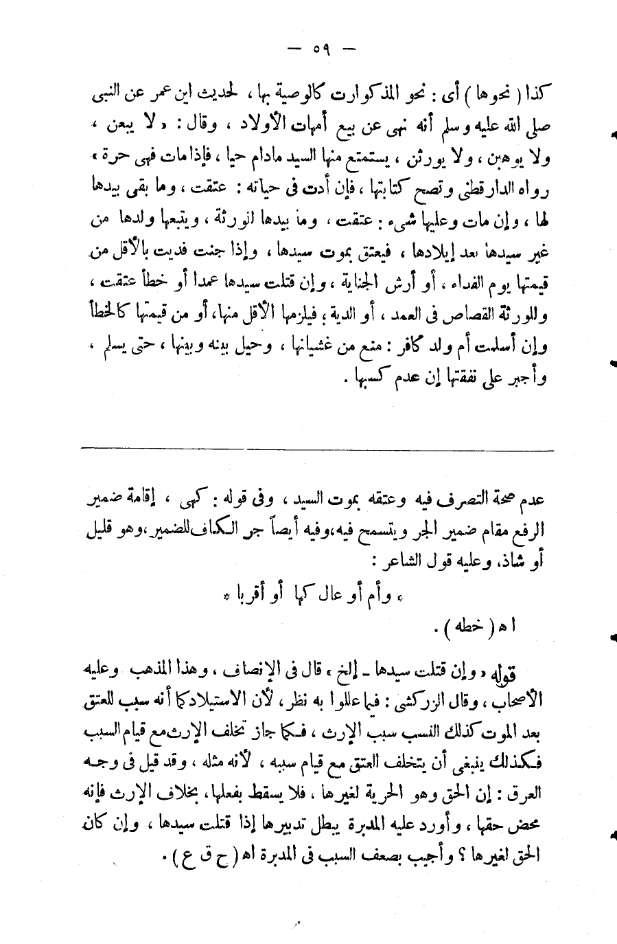 كذا ( نحوها ) أي نحو المذكورات كالوصية بها لحديث ابن عمر عن النبي صلى الله عليه وسلم أنه نهى عن بيع أمهات الأولاد وقال لا يبعن ولا يوهبن ولا يورثن يستمتع منها السيد مادام حيا فإذا مات فهي حرة رواه الدارقطني وتصح كتابتها فإن أدت في حياته عتقت وما بقي بيدها لها وإن مات وعليها شيء عتقت وما بيدها للورثة ويتبعها ولدها من غير سيدها بعد إيلادها فيعتق بموت سيدها وإذا جنت فديت بالأقل من قيمتها يوم الفداء أو أرش الجناية وإن قتلت سيدها عمدا أو خطأ عتقت وللورثة القصاص في العمد أو الدية فيلزمها الأقل منها أو من قيمتها كالخطأ وإن أسلمت أم ولد كافر منع من غشيانها وحيل بينه وبينها حتى يسلم وأجبر على نفقتها إن عدم كسبها