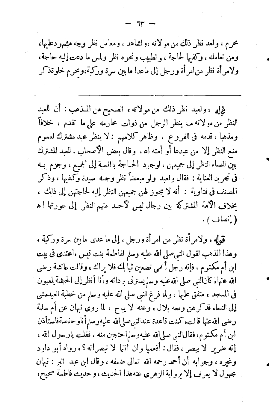 محرم ولعد نظر ذلك من مولاته ولشاهد ومعامل نظر وجه مشهود عليها ومن تعامله وكفيها لحاجة ولطبيب ونحوه نظر ولمس ما دعت إليه حاجة ولامرأة نظر من امرأة ورجل إلى ما عدا ما بين سرة وركبة ويحرم خلوة ذكر