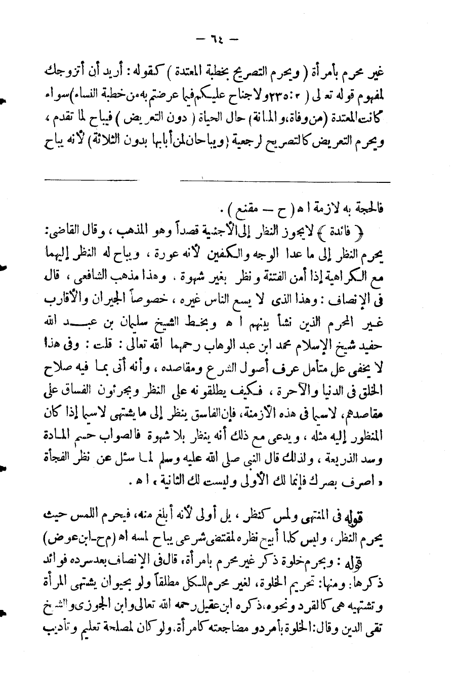 غير محرم بامرأة ( ويحرم التصريح بخطبة المعتدة ) كقوله أريد أن أتزوجك لمفهوم قوله تعالى { ولا جناح عليكم فيما عرضتم به من خطبة النساء } سواء كانت المعتدة ( من الوفاة والمبانه ) حال الحياة ( دون التعريض ) فيباح لما تقدم ويحرم التعريض كالتصريح لرجعية ( ويباحان لمن أبابها بدون الثلاثة ) لأنه يباح