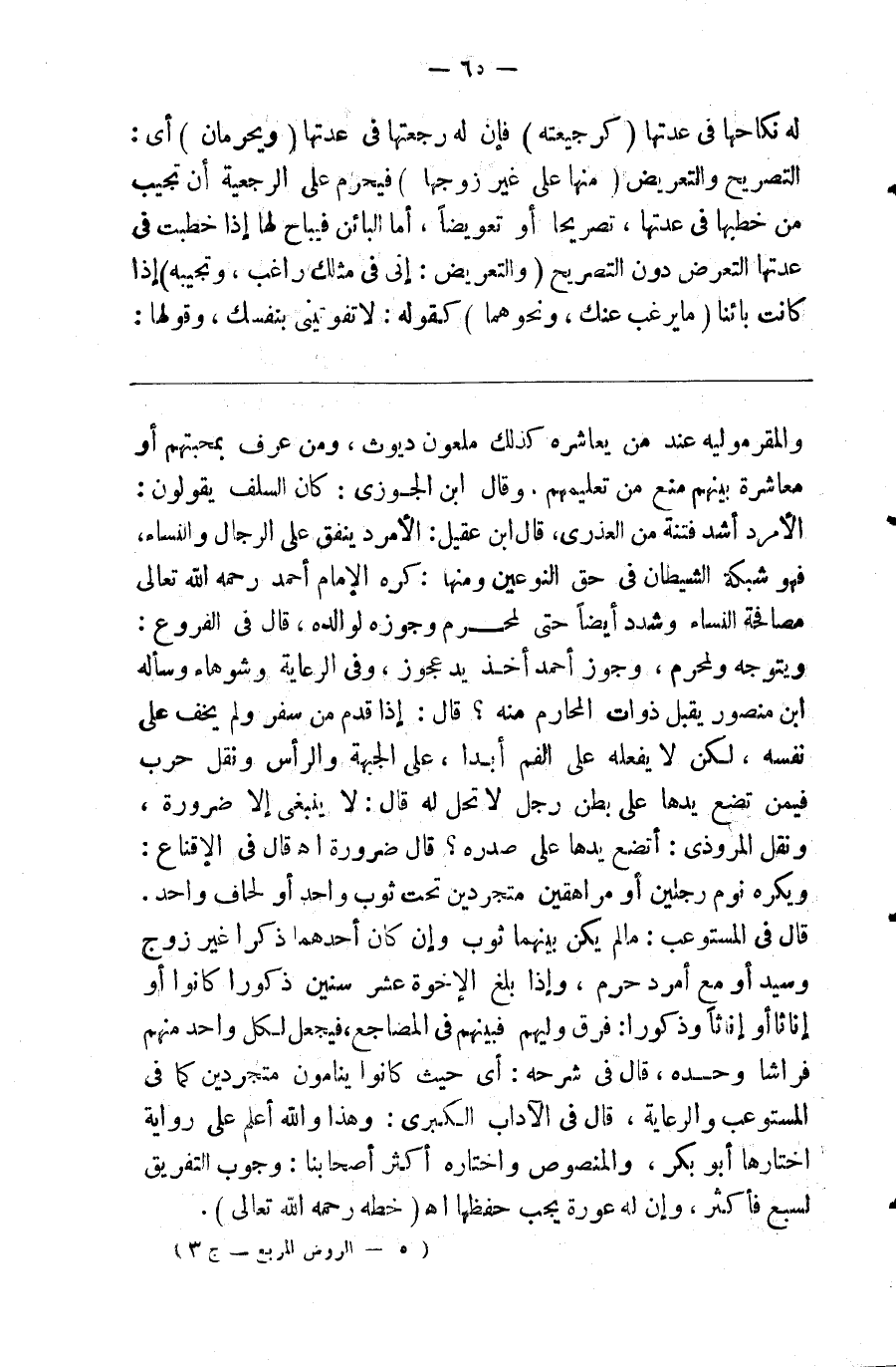 له نكاحها في عدتها ( كرجعية ) فإن له رجعتها في عدتها ( ويحرمان ) أي التصريح والتعريض ( منها على غير زوجها ) فيحرم على الرجعية أن تجيب من خطبها في عدتها تصريحا أو تعريضا وأما البائن فيباح لها إذا خطبت في عدتها التعريض دون التصريح ( والتعريض إني في مثلك لراغب وتجيبه ) إذا كانت بائنا ( ما يرغب عنك ونحوهما ) كقوله لاتفوتيني بنفسك وقولها