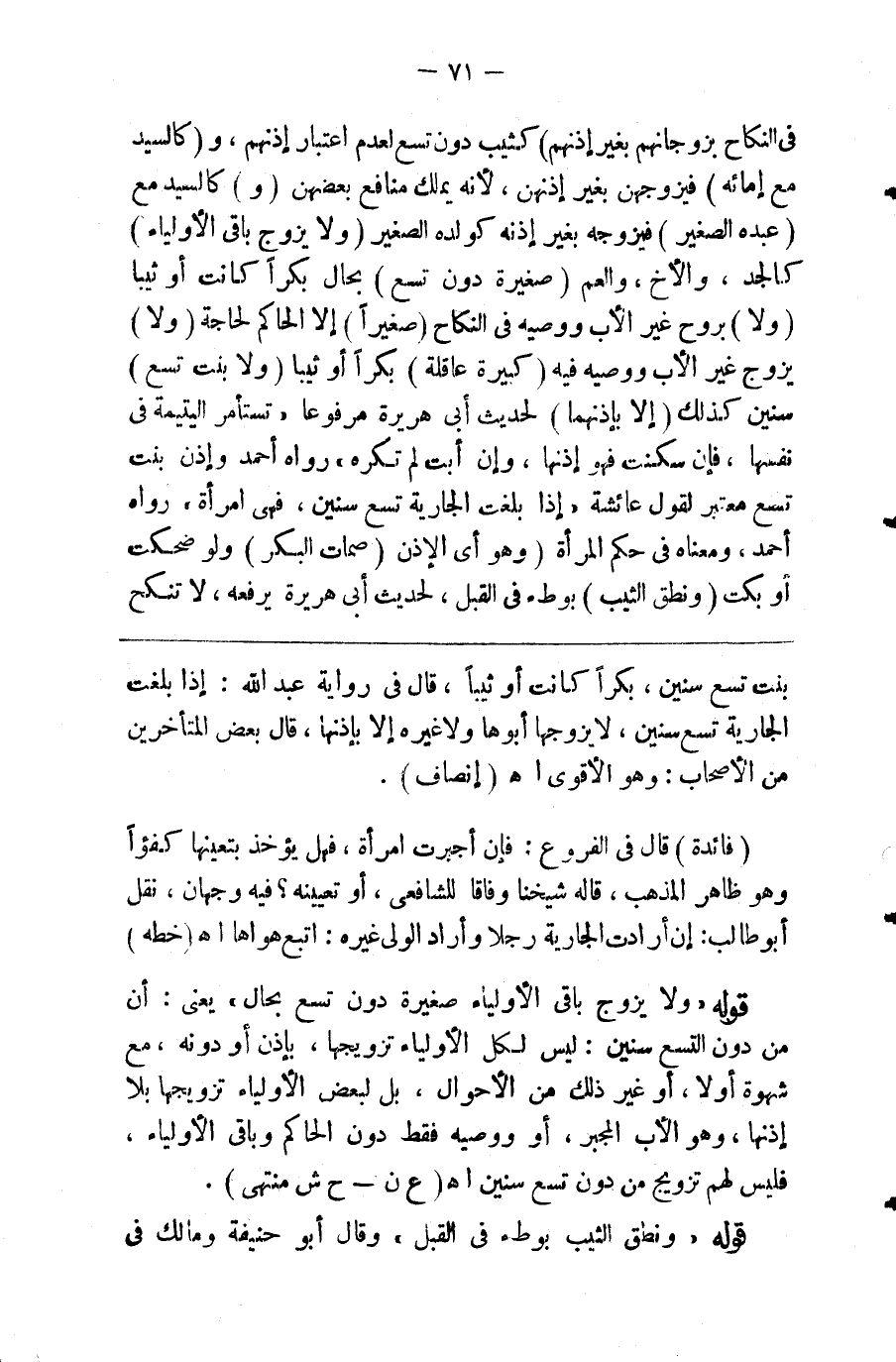 في النكاح يزوجانهم بغير إذنهم ) كثيب دون تسع لعدم اعتبار إذنهم أو ( كالسيد مع إمائه ) فيزوجهن بغير إذنهن لأنه يملك منافع بضعهن ( و ) كالسيد مع ( عبده الصغير ) فيزوجه بغير إذنه كولده الصغير ( ولا يزوج باقي الأولياء ) كالجد والأخ والعم ( صغيرة دون تسع ) بحال بكرا كانت أو ثيبا ( ولا ) يزوج غير الأب ووصيه في النكاح ( صغيرا ) إلا الحاكم لحاجة ( ولا ) يزوج غير الأب ووصيه فيه ( كبيرة عاقلة ) بكرا أو ثيبا ( ولا بنت تسع ) سنين كذلك ( إلا بإذنها ) لحديث أبي هريرة مرفوعا تستأمر اليتيمة في نفسها فإن سكتت فهو إذنها وإن أبت لم تكره رواه أحمد وإذن بنت تسع معتبر لقول عائشة إذا بلغت الجارية تسع سنين فهي امرأة رواه أحمد ومعناه في حكم المرأة ( وهو ) أي الإذن ( صمات البكر ) ولو ضحكت أو بكت ( ونطق الثيب ) بوطء في