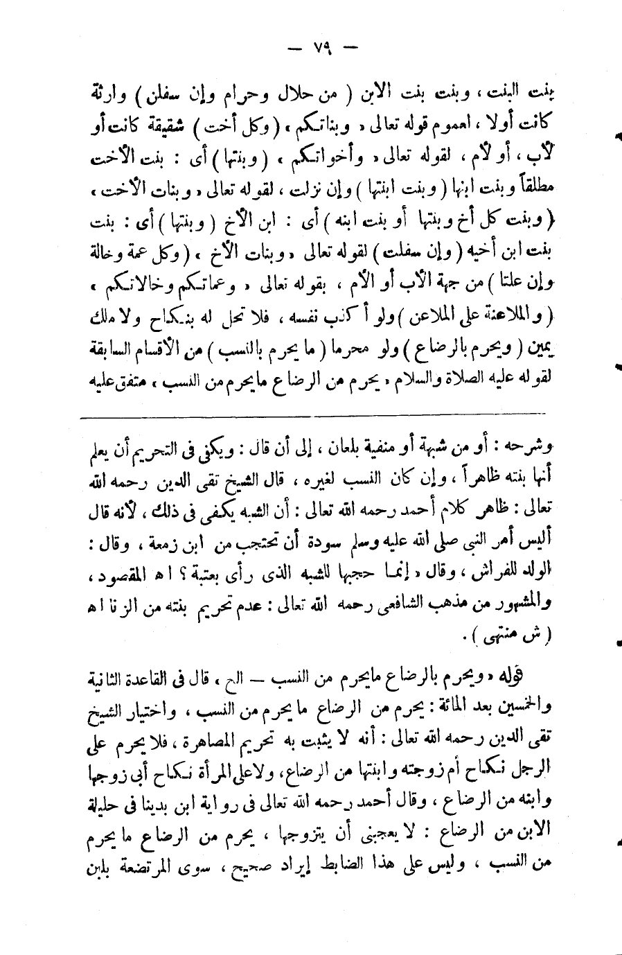 بنت البنت وبنت بنت الابن ( من وكل أخت شقيقة كانت أو لأب أو لأم لقوله تعالى { وأخواتكم } وبنتها أي بنت الأخت مطلقا وبنت ابنها ( وبنت ابنتها ) وإن نزلت لقوله تعالى { وبنات الأخت } وبنت كل أخ وبنتها وبنت ابنه ) أي ابن الأخ ( وبنتها ) أي بنت بنت ابن أخيه ( وإن سفلت ) لقوله تعالى { وبنات الأخ } وكل عمة وخالة وإن علتا من جهة الأب أو الأم لقوله تعالى { وعماتكم وخالاتكم } والملاعنة على الملاعن ولو أكذب نفسه فلا تحل له بنكاح ولا ملك يمين ( ويحرم بالرضاع ) ولو محرما ( ما يحرم بالنسب ) من الأقسام السابقة لقوله صلى الله عليه وسلم يحرم من الرضاع ما ( أخت ابنه ) من رضاع فلا تحرم المرضعة ولا بنتها على أبي المرتضع وأخيه من نسب ولا أم المرتضع وأخته من نسب على أبي المرتضع وابنه الذي هو أخو المرتضع لأنهن في مقابلة من يحرم بالمصاهرة لا بالنسب ( ويحرم ) بالمصاهرة ب ( العقد ) وإن لم يحصل دخول ولا خلوة ( زوجة أبيه ) ولو من رضاع ( وزوجة كل جد ) وإن علا لقوله تعالى { ولا تنكحوا } يحرم من النسب متفق عليه