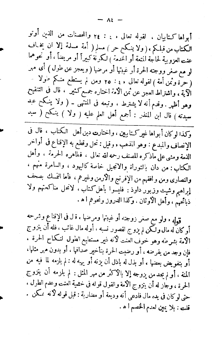 ولا ينكح حر مسلم أمة مسلمة إلا أن يخاف عنت العزوبة لحاجة المتعة أو الخدمة لكونه كبيرا أو مريضا أو نحوهما ولو مع صغر زوجته الحرة أو غيبتها أو مرضها ( ويعجز عن طول ) أي مهر ( حرة وثمن أمة ) لقوله تعالى { ومن لم يستطع منكم طولا } الآية واشتراط العجز عن ثمن الأمة اختاره جمع كثير قال في التنقيح وهو أظهر وقدم أنه لا يشترط وتبعه في المنتهى ( ولا ينكح عبد سيدته ) قال ابن المنذر أجمع أهل العلم عليه ( ولا ) ينكح ( سيد