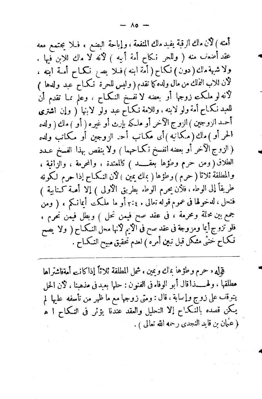 أمته ) لأن ملك الرقبة يفيد ملك المنفعة وإباحة البضع فلا يجتمع معه عقد أضعف منه ( وللحر نكاح أمة أبيه ) لأنه لا ملك للابن فيها ولا شبهة ملك ( دون ) نكاح ( أمة ابنه ) فلا يصح نكاحه أمة ابنه لأن الأب له التملك من مال ولده كما تقدم ( وليس للحرة نكاح عبد ولدها ) لأنه لو ملك زوجها أو بعضه لا نفسخ النكاح وعلم مما تقدم أن للعبد نكاح أمة ولو لابنه وللأمة نكاح عبد ولو لابنها ( وإن اشترى أحد الزوجين ) الزوج الأخر أو ملكه بإرث أو غيره ( أو ) ملك ( ولده الحر أو ) ملك ( مكاتبه ) أي مكاتب أحد الزوجين أو مكاتب ولده ( الزوج الآخر أو بعضه انفسخ نكاحهما ) ولا ينقص بهذا الفسخ عدد الطلاق ( ومن حرم وطؤها بعقد ) كالمعتدة والمحرمة والزانية والمطلقة ثلاثا ( حرم ) وطؤها ( بملك يمين ) لأن النكاح إذا حرم لكونه طريقا إلى الوطء فلأن يحرم الوطء بطريق الأولى ( إلا أمة كتابية ) فتحل لدخولها في عموم قوله تعالى { أو ما ملكت أيمانكم } ومن جمع بين محللة ومحرمة في عقد صح فيمن تحل وبطل فيمن تحرم فلو تزوج أيما ومزوجة في عقد صح في الأيم لأنها محل النكاح ( ولا يصح نكاح خنثى مشكل قبل تبين أمره ) لعدم تحقق مبيح النكاح