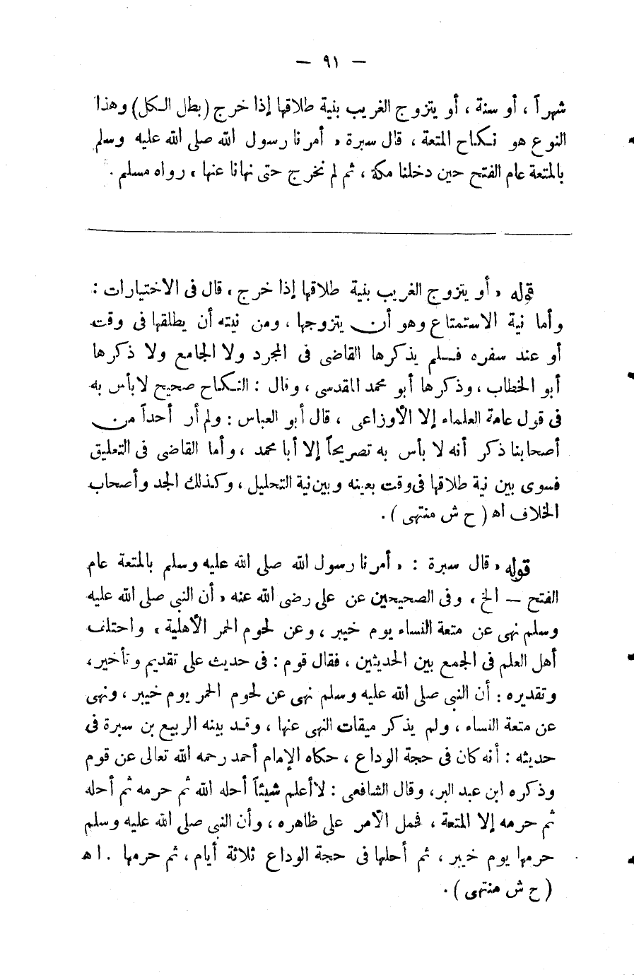 شهرا أو سنة أو يتزوج الغريب بنية طلاقها إذا خرج ( بطل الكل ) وهذا النوع هو نكاح المتعة قال سبرة أمرنا رسول الله صلى الله عليه وسلم بالمتعة عام الفتح حين دخلنا مكة ثم لم نخرج حتى نهانا عنها رواه مسلم % 1