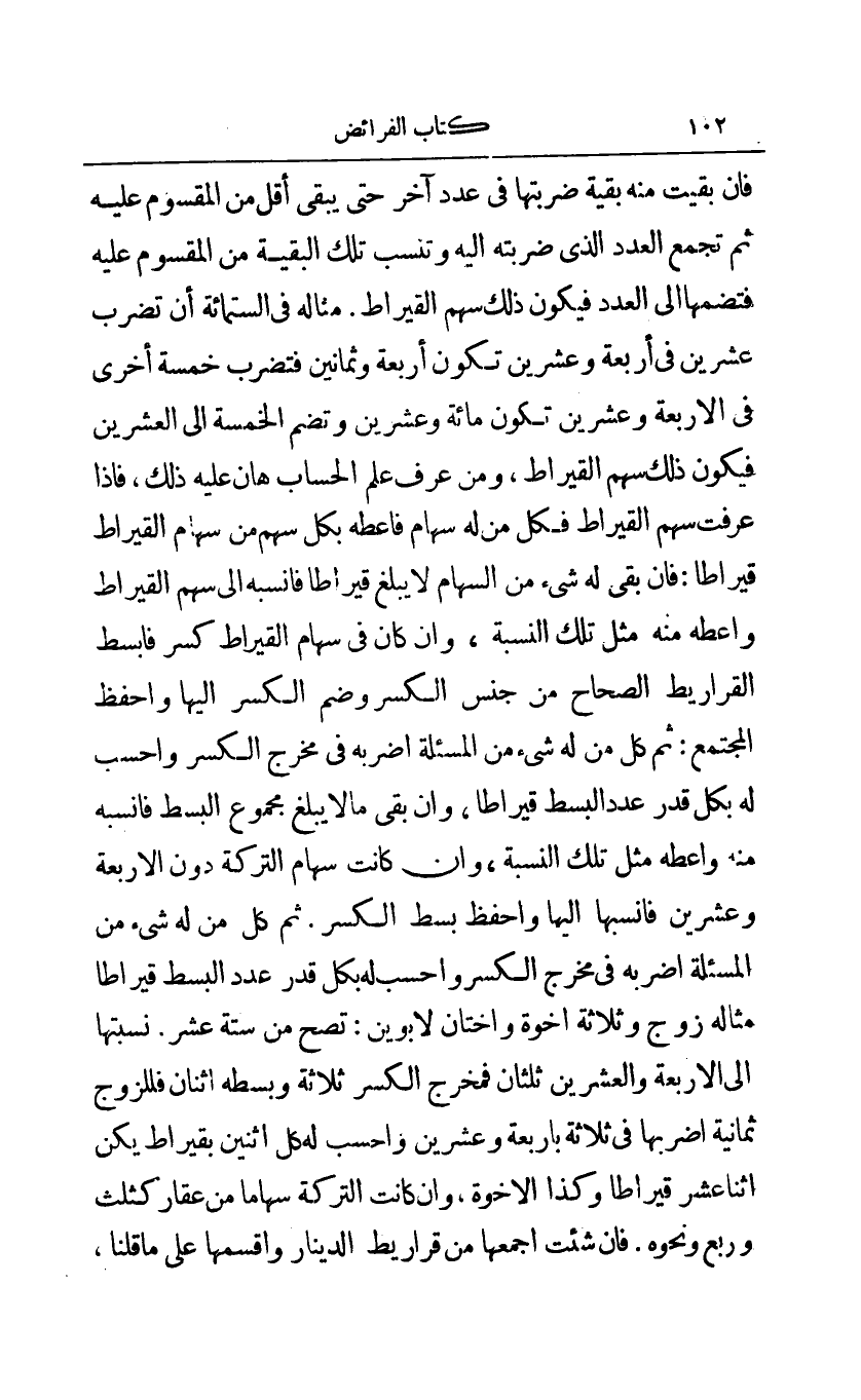 فأن بقيت منه بقية ضربتها في عدد آخر حتى يبقى أقل من المقسوم عليه ثم تجمع العدد الذي ضربته إليه وتنسب تلك البقية من المقسوم عليه فتضمها إلى العدد فيكون ذلك سهم القيراط مثاله في الستمائة أن تضرب عشرين في أربعة وعشرين تكون أربعة وثمانين فتضرب خمسة أخرى في الأربعة وعشرين تكون مائة وعشرين وتضم الخمسة إلى العشرين فيكون ذلك سهم القيراط ومن عرف علم الحساب هان عليه ذلك فإذا عرفت سهم القيراط فكل من له سهام فأعطه بكل سهم من سهام القيراط قيراطا: فان بقي له شيء من السهام لا يبلغ قيراطا فأنسبه إلى سهم القيراط وأعطه منه مثل تلك النسبة وأن كان في سهام القيراط كسر فابسط القراريط الصحاح من جنس الكسر وضم الكسر إليها وأحفظ المجتمع: ثم كل من له شيء من المسالة أضربه في مخرج الكسر وأحسب له بكل عدد البسط قيراطا وأن بقي ما لا يبلغ مجموع البسط فأنسبه منه وأعطه مثل تلك النسبة وأن كانت سهام التركة دون الأربعة وعشرين فأنسبها إليها وأحفظ بسط الكسر ثم كل من له شيء من المسألة اضربه في مخرج الكسر واحسب له بكل قدر عدد البسط قيراطا مثاله زوج وثلاثة أخوة وأختان لأبوين: تصح من ستة عشر نسبتها إلى الأربعة والعشرين ثلثان فمخرج الكسر ثلاثة وبسطه اثنان فللزوج ثمانية أضربها في ثلاثة بأربعة وعشرين واحسب له كل اثنين بقيراط يكن اثنا عشر قيراطا وكذا الأخوة وأن كانت التركة سهاما من عقار كثلث وربع ونحوه فأن شئت اجمعها من قراريط الدينار وأقسمها على ما قلنا,