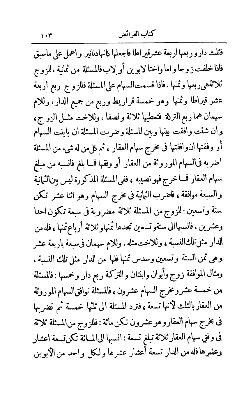 فثلث دار وربعها أربعة عشر قيراطا فاجعلها كأنها دنانير واعمل على ما سبق فإذا خلفت زوجا وأما وأختا لأبوين أو لأب فالمسألة من ثمانية للزوج ثلاثة هي ربعها وثمنها فإذا قسمت السهام على المسألة فللزوج ربع أربعة عشر قيراطا وثمنها وهو خمسة قراريط وربع من جميع الدار وللأم سهمان هما ربع التركة فتعطيها ثلاثة ونصفا وللأخت مثل الزوج وأن شئت وافقت بينها وبين المسألة وضربت المسألة أن باينت السهام أو وفقتها في مخرج سهام العقار ثم كل من له شيء من المسألة أضربه في السهام الموروثة من العقار أو وفقها فما بلغ فأنسبه من مبلغ سهام العقار فما خرج فهو نصيبه ففي المسألة المذكورة ليس بين الثمانية والسبعة موافقة فأضرب الثمانية في مخرج السهام وهو اثنا عشر تكن ستة وتسعين: للزوج من المسألة ثلاثة مضروبة في سبعة تكون أحدا وعشرين فأنسبها إلى ستة وتسعين تجدها ثمنها وثلاثة أرباع ثمنها فله من الدار مثل تلك النسبة وللأخت مثله وللأم سهمان في سبعة بأربعة عشر وهي ثمن الستة وتسعين وسدس ثمنها فلها من الدار مثل تلك النسبة ومثال الموافقة زوج وأبوان وابنتان والتركة ربع دار وخمسها: فالمسألة من خمسة عشر ومخرج السهام عشرون فالمسألة توافق السهام الموروثة من العقار بالثلث لأنها تسعة فترد المسالة إلى ثلثها خمسة ثم تضربها في مخرج سهام العقار وهو عشرون تكن مائة: فللزوج من المسائلة ثلاثة في وفق سهام العقار ثلاثة تبلغ: انسبها إلى المائة تكن تسعة أعشار وعشرها فله من الدار تسعة أعشار عشرها ولكل واحد من الأبوين