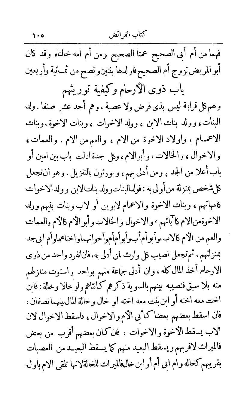 وهم قرابة ليس بذي فرض ولا عصبة وهم أحد عشر صنفا ولد البنات وولد بنات الابن وولد الأخوات وبنات الأخوة وبنات الأعمام وأولاد الأخوة من الأم والعم من الأم والعمات والأخوال والخالات وأبو الأم وكل جدة أدلت باب بين أمين أو باب أعلا من الجد ومن أدلى بهم ويورثون بالتنزيل وهو أن تجعل كل شخص بمنزلة من أولى به فولد البنات وولد بنات الابن وولد الأخوات كأمهاتهم وبنات الأخوة والأعمام لأبوين أو لأب وبنات بنيهم وولد الأخوة من الأم كآبائهم والأخوال والخالات وأبو الأم كالأم والعمات والعم من الأم كالأب وأبو أم أب وأبو أم أم وأخواتهما وأختاهما وأم أبي جد بمنزلتهم ثم تجعل نصيب كل وارث لمن أدلى به فان انفرد واحد من ذوي الأرحام أخذ المال كله وأن أدلى جماعة منهم بواحد واستوت منازلهم منه بلا سبق فنصيبه بينهم بالسوية ذكرهم كأنثاهم ولو خالا وخالة: فابن أخت معه أخته أو ابن بنت معه أخته أو خال أو خالة المال بينهما نصفان فأن أسقط بعضهم بعضا كأبي الأم والأخوال فاسقط الأخوال لأن الأب يسقط الأخوة والأخوات فأن كان بعضهم أقرب من بعض فالميراث لأقربهم ويسقط البعيد منهم كما يسقط البعيد من العصبات بقريبهم كخاله وأم أبي أم أو ابن خال فالميراث للخالة لأنها تلقي الأم بأول