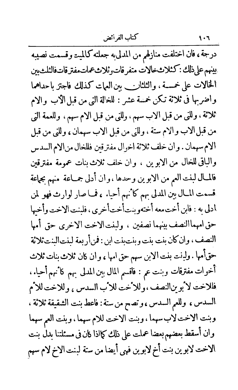درجة فأن اختلفت منازلهم من المدلى جعلته كالميت وقسمت نصيبه بينهم على ذلك: كثلاث خالات متفرقات وثلاث عمات مفترقات فالثلث بين الخالات على خمسة والثلثان بين العمات كذلك فاجتز بإحداهما واضربها في ثلاثة تكن خمسة عشر ك للخالة التي من قبل الأب والأم ثلاثة وللتي من قبل الأب سهم وللتي من قبل الأم سهم وللعمة التي من قبل الأب والأم ستة وللتي قبل الأب سهمان وللتي من قبل الأم سهمان وأن خلف ثلاثة أخوال مفترقين فللخال من الأم السدس والباقي للخال من الأبوين وأن خلف ثلاث بنات عمومة منهم بجماعة قسمت المال بين المدلي بهم كأنهم أحياء فما صار لوارث فهو لمن أدلى به فابن أخت معه أخته وبنت أخت أخرى فلبنت الأخت وأخيها حق أمهما النصف بينهما نصفين ولبنت الأخت الأخرى حق أمها النصف وأن كان بنت بنت ابن: فمن أربعة لبنت البنت ثلاثة حق أمها ولبنت بنت الابن سهم حق أمها وأن كان ثلاث بنات ثلاث أخوات مفترقات وبنت عم: فأقسم المال بين المدلي بهم كأنهم أحياء فللأخت لأبوين النصف وللأخت للأب السدس وللأخت للأم السدس وللعم السدس وتصح من ستة فأعط بنت الشقيقة ثلاثة وبنت الأخت لأب سهما وبنت الأخت للأم سهما وبنت العم سهما وأن أسقط بعضهم بعضا عملت على ذلك كما إذا كان في مسألتنا بدل بنت الأخت لأبوين بنت أخ لأبوين فهي أيضا من ستة لبنت الأخ لأم سهم