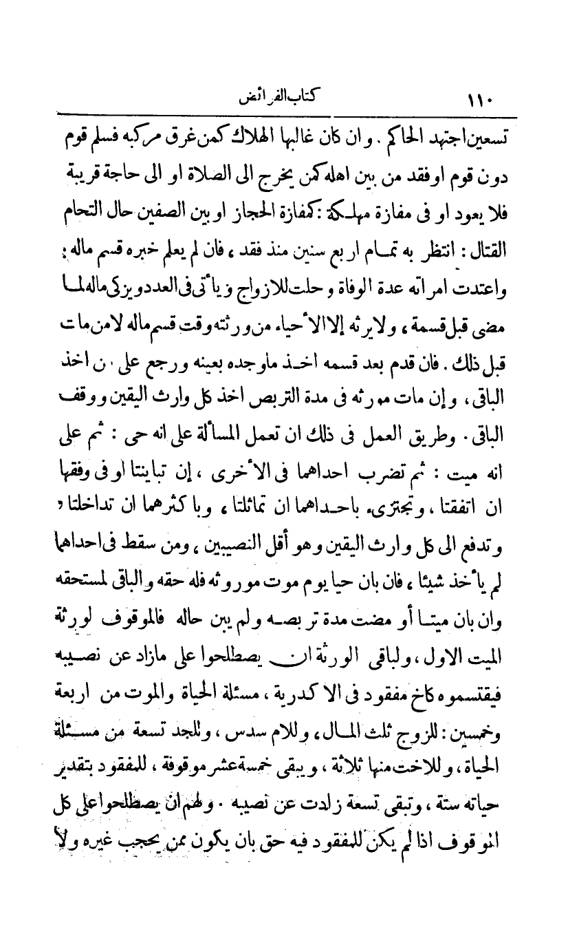 تسعين اجتهد الحاكم وأن كان غالبها الهلاك كمن غرق مركبه فسلم قوم دون قوم أو فقد من بين أهله كمن يخرج إلى الصلاة أو إلى حاجة قريبة فلا يعود أو في مفازة مهلكة: كمفازة الحجاز أو بين الصفين حال التحام القتال: انتظر به تمام أربع سنين منذ فقد فأن لم يعلم خبره قسم ماله واعتدت امرأته عدة الوفاة وحلت للأزواج ويأتي في العدد ويزكي ماله لما مضى قبل قسمة ولا يرثه إلا الأحياء من ورثته وقت قسم ماله لا من مات قبل ذلك فأن قدم بعد قسمه أخذ ما وجده ورجع على من أخذ الباقي وإن مات مورثه في مدة التربص أخذ كل وارث اليقين ووقف الباقي وطريق العمل في ذلك أن تعمل المسألة على أنه حي: ثم على أنه ميت: ثم تضرب إحداهما في الأخرى إن تباينتا أو في وفقها أن اتفقتا وتجتزئ بإحداهما أن تماثلنا وبأكثرهما أن تداخلتا وتدفع إلى كل وارث اليقين وهو أقل النصيبين ومن سقط في إحداهما لم يأخذ شيئا فأن بان حيا موت موروثه فله حقه والباقي لمستحقه وأن بان ميتا أو مضت مدة تربصه ولم يبن حاله فالموقوف لورثه الميت الأول ولباقي الورثة أن يصطلحوا على ما زاد عن نصيبه فيقتسموه كأخ مفقود في الأكدرية مسألة الحياة والموت من أربعة وخمسين: للزوج ثلث المال وللأم سدس وللجد تسعة من مسألة الحياة وللأخت منها ثلاثة ويبقى خمسة عشر موقوفة للمفقود بتقدير حياته ستة وتبقى تسعة زادت عن نصيبه ولهم أن يصطلحوا على كل الموقوف إذا لم يكن للمفقود فيه حق بأن يكون ممن يحجب غيره ولا