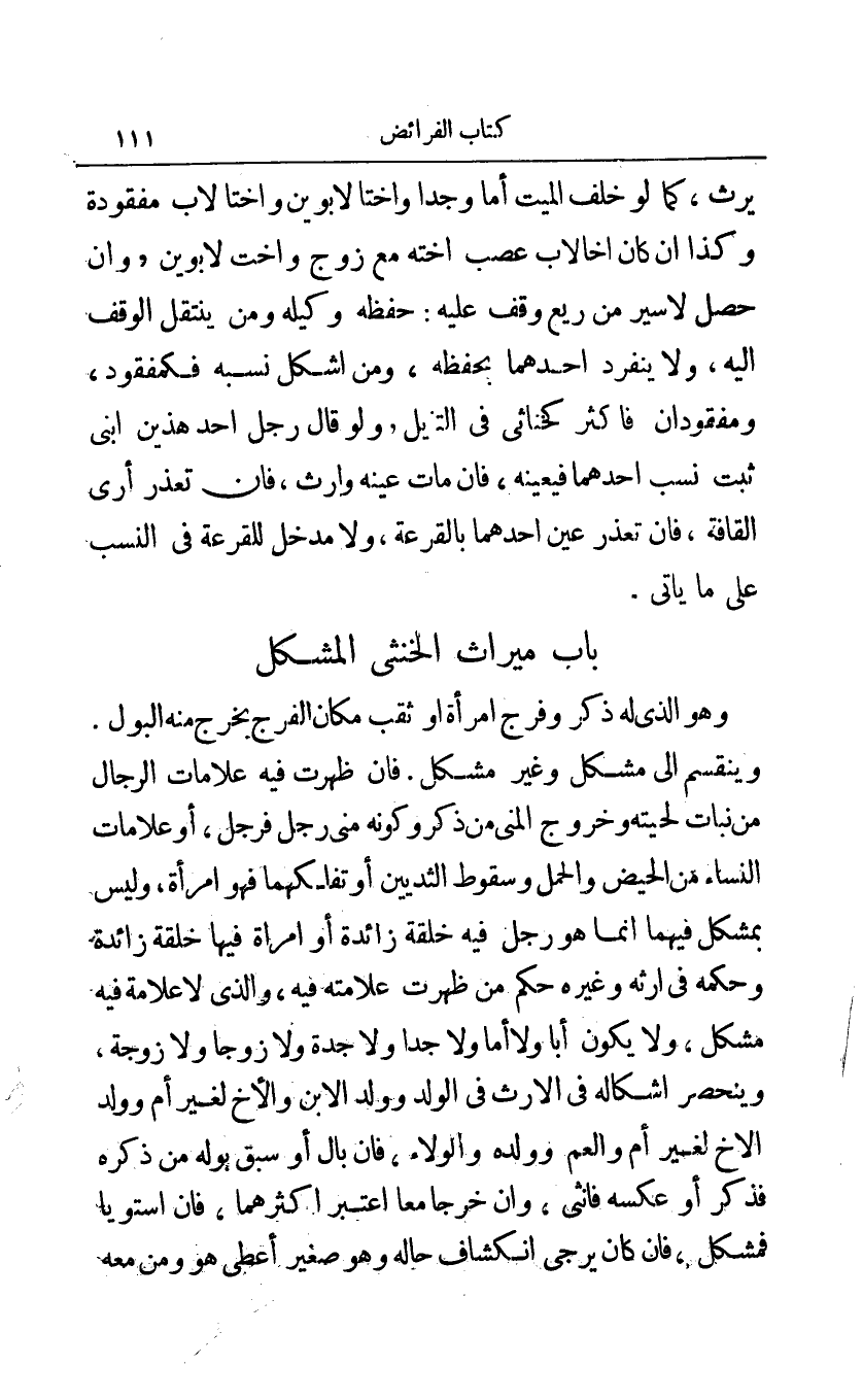 وهو الذي له ذكر وفرج امرأة وثقب مكان الفرج يخرج منه البول وينقسم إلى مشكل إلى مشكل وغير مشكل فأن ظهرت فيه علامات الرجال من نبات لحيته وخروج المني من ذكر وكونه مني رجل فرجل أو علامات النساء من الحيض والحمل وسقوط الثديين أو تفلكهما فهو امرأة وليس بمشكل فيهما إنما هو رجل فيه خلقة زائدة أو امرأة فيها خلقة زائدة وحكمه في إرثه وغيره حكم من ظهرت علامته فيه والذي لا علامة فيه مشكل ولا يكون أبا ولا أما ولا جدا ولا جدة ولا زوجا ولا زوجة وينحصر أشكاله في الإرث في الولد وولد الابن والأخ لغير أم وولد الأخ لغير أم والعم وولده والولاء فأن بال أو سبق بوله من ذكره فذكر أو عكسه فأنثى وأن خرجا معا اعتبر أكثرهما فأن استويا فمشكل فأن كان يرجى انكشاف حاله وهو صغير أعطي هو من معه