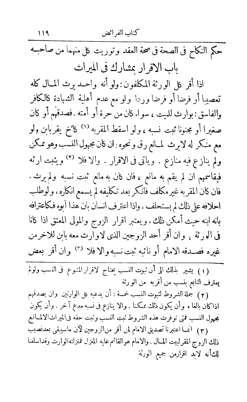 3 إنما اعتبرنا تصديق الإمام لمن أقر م الزوجين لأن ما سيبقى بعد نصيب ذلك الزوج المقر لبيت المال. والإمام هو القائم عليه المنزل فمنزلته الوارث وقد أسلفنا لك أنه لا بد إقرار من جميع الورثة.
