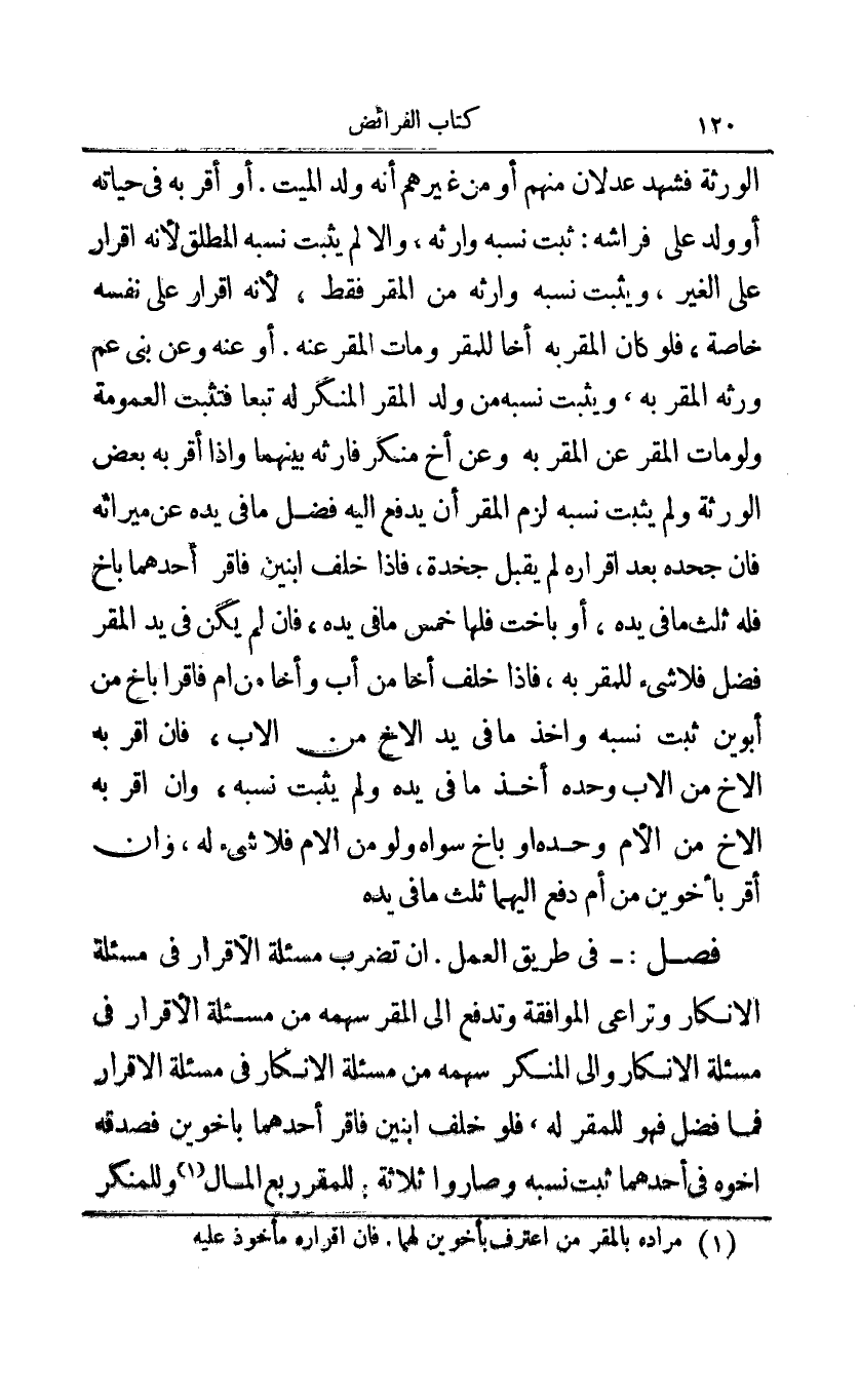 الورثة فشهد عدلان منهم أو من غيرهم أنه ولد الميت أو أقر في حياته أو ولد على فراشه: ثبت نسبه وارثه وإلا يثبت نسبه المطلق لأنه إقرار على الغير ويثبت نسبه وإرثه من المقر فقط لأنه إقرار على نفسه خاصة فلو كان المقربة أخا للمقر ومات المقر عنه أو عنه وعن بني عم ورثه المقر به ويثبت نسبه من ولد المقر المنكر له تبعا فتثبت العمومة ولو مات المقر عن المقر به وعن أخ منكر فإرثه بينهما وإذا أقر به بعض الورثة ولم يثبت نسبه لزم المقر أن يدفع إليه فضل ما في يده عن ميراثه فأن جحده بعد إقراره لم يقبل جحده فإذا خلف ابنين فأقر أحدهما بأخ فله ثلث ما في يده أو بأخت فلها خمس ما في يده فأن لم يكن في يد المقر فضل فلا شيء للمقر به فإذا خلف أخا من أب وأخا من أم فأقر بأخ من أبوين ثبت نسبه وأخذ ما في يد الأخ من الأب فأن أقر به الأخ من الأب وحده أخذ ما في يده ولم يثبت نسبه وأن أقر به الأخ من الأم وحده أو بأخ سواه ولو من الأم فلا شيء له وأن أقر بأخوين من أم دفع إليهما ثلث ما في يده.