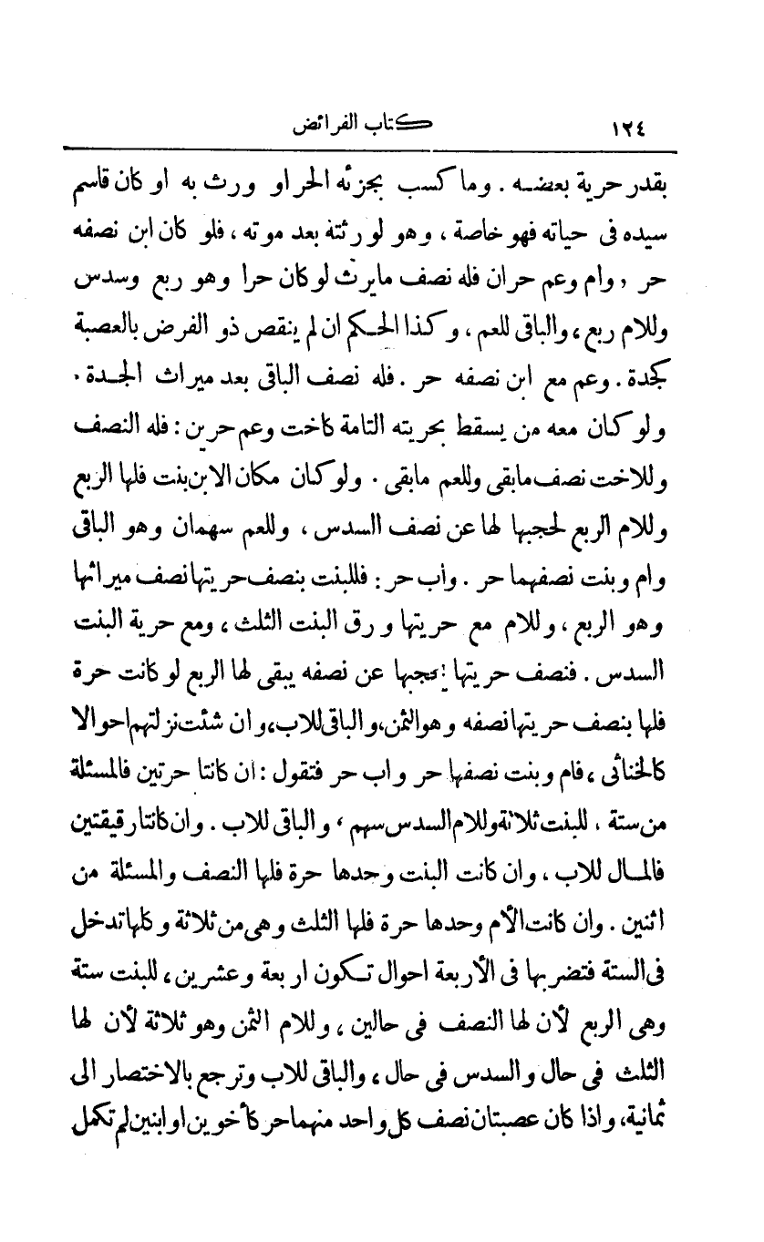 بقدر حرية بعضه وما كسب بجزئه الحر أو ورث به أو كان قاسم سيده في حياته فهو خاصة وهو لورثته لو كان حرا وهو ربع وسدس وللأم ربع والباقي للعم وكذا الحكم أن لم ينقص ذو الفرض بالعصبة كجدة وعم مع ابن نصفه حر فله نصف الباقي بعد ميراث الجدة ولو كان معه من يسقط بحريته التامة كأخت وعم حرين فله النصف وللأخت نصف ما بقي وللعم ما بقي ولو كان مكان الابن بنت فلها الربع وللأم الربع لحجبها لها عن نصف السدس وللعم سهمان وهو الباقي وأم وبنت نصفهما حر وأب حر: فللبنت بنصف حريتها نصف ميراثها وهو الربع وللأم مع حريتها ورق البنت الثلث ومع حرية البنت السدس فنصف حريتها يحجبها عن نصفه يبقى لها الربع لو كانت حرة فلها بنصف حريتها نصفه وهو الثمن والباقي للأب وأن شئت نزلتهم أحوالا كالخناثي فأم وبنت نصفها حر وأب حر فتقول: أن كانتا حرتين فالمسألة من ستة للبنت ثلاثة وللأم السدس سهم والباقي للأب وأن كانتا رقيقتين فالمال للأب وأن كانت البنت وحدها حرة فلها النصف والمسألة من اثنين وأن كانت الأم وحدها حرة فلها الثلث وهي من ثلاثة وكلها تدخل في السنة فتضربها في الأربعة أحوال تكون أربعة وعشرين للبنت ستة وهي الربع لأن لها النصف في حالين وللأم الثمن وهو ثلاثة لأن لها الثلث في حال السدس في حال والباقي للأب وترجع بالاختصار إلى ثمانية وإذا كان عصبتان نصف كل واحد منهما حر كأخوين أو ابنين لم تكمل